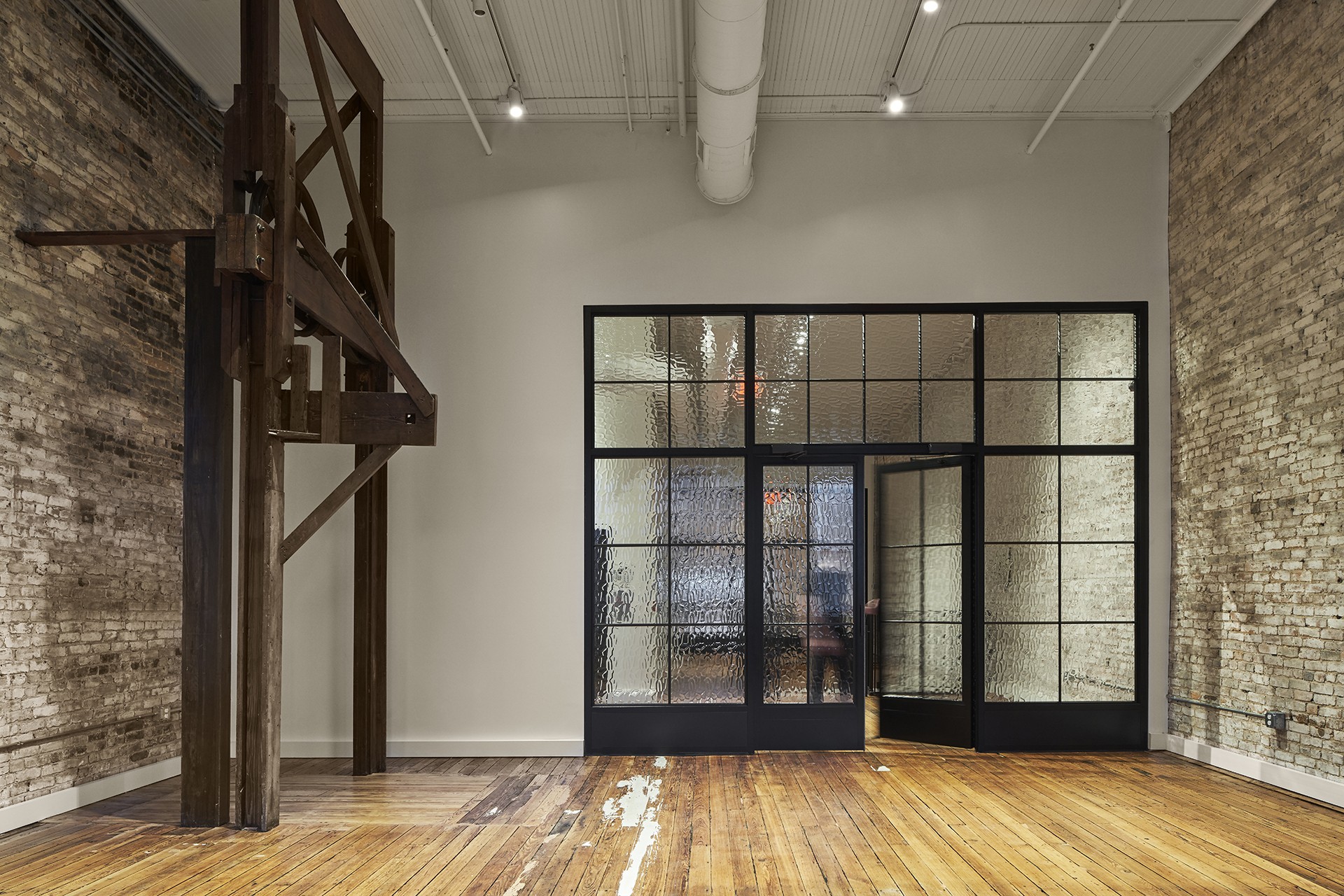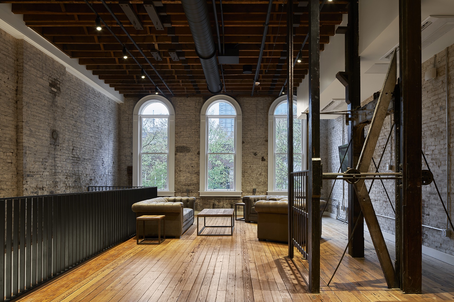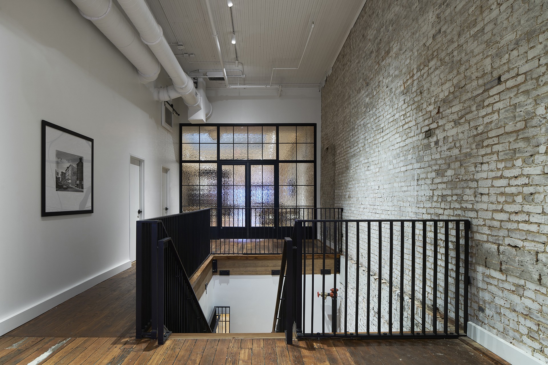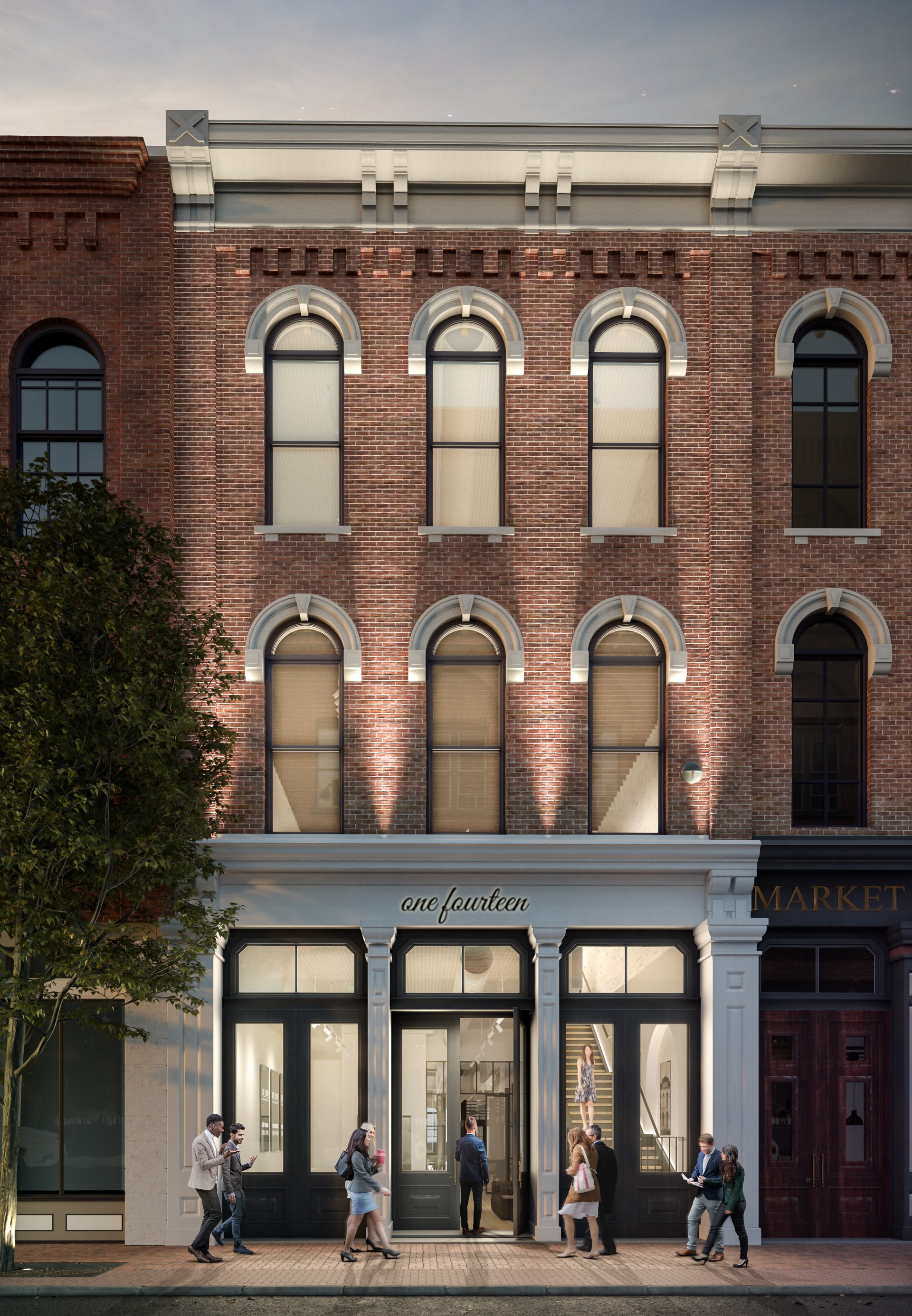 One Fourteen’s historic features include original tongue & groove floors, exposed timber floors joists, beadboard ceilings, exposed masonry party walls, two historic hoistways, and a vault originally used by the warehouse retailer. On the exterior, all historic window and building cornices were given a fresh coat of paint. The ground level was once again opened to the street with new 11’ tall stile & rail doors accompanied by historically respectful windows.