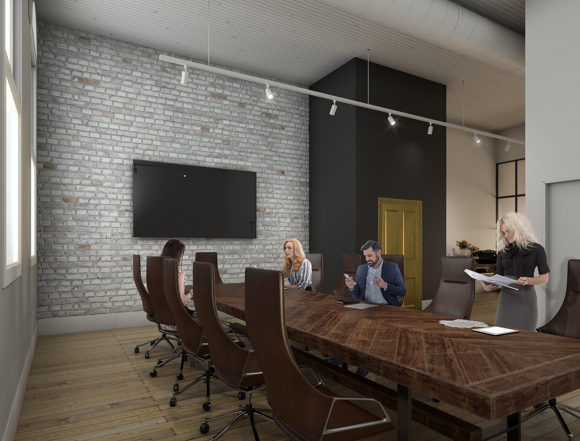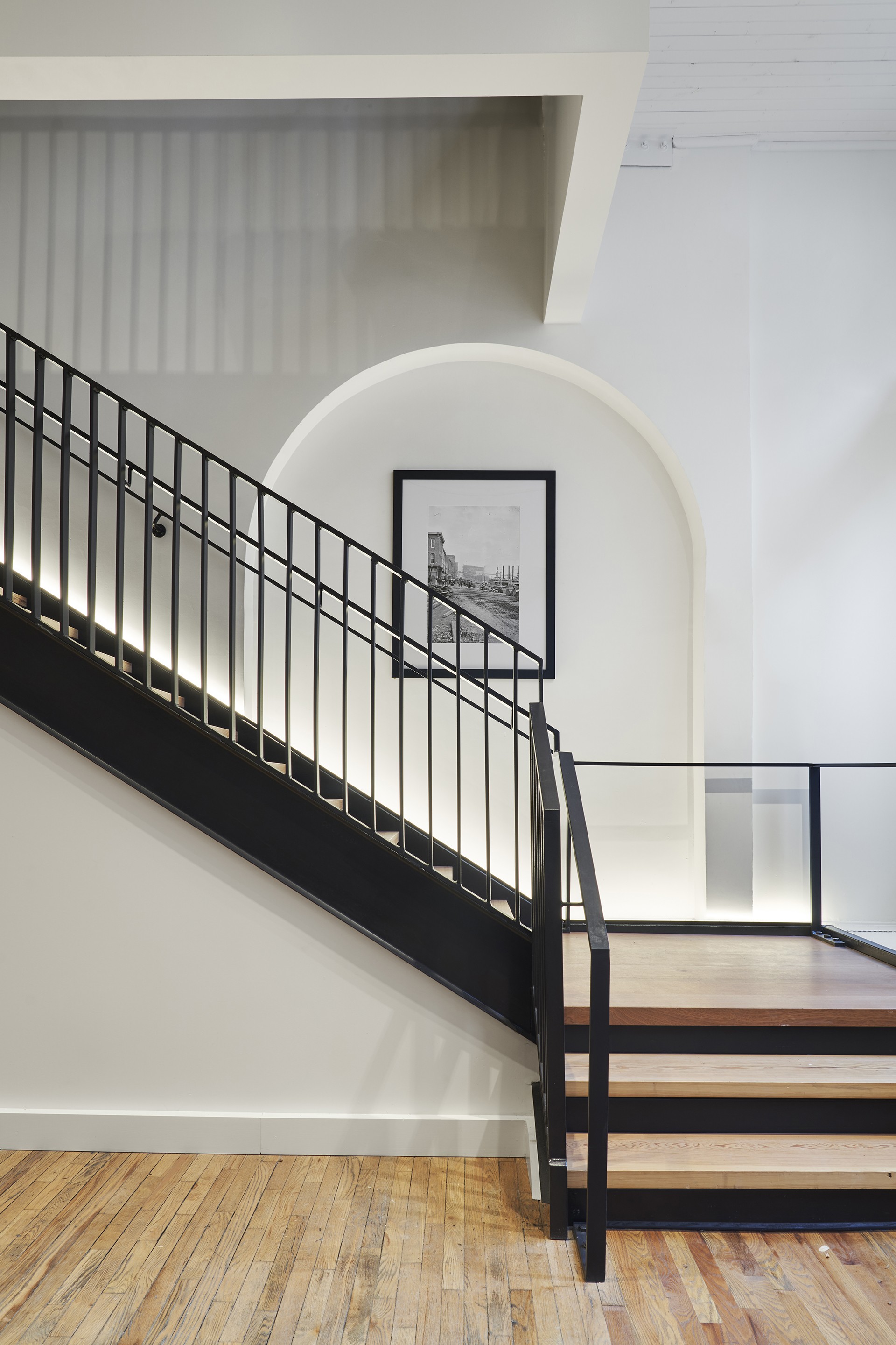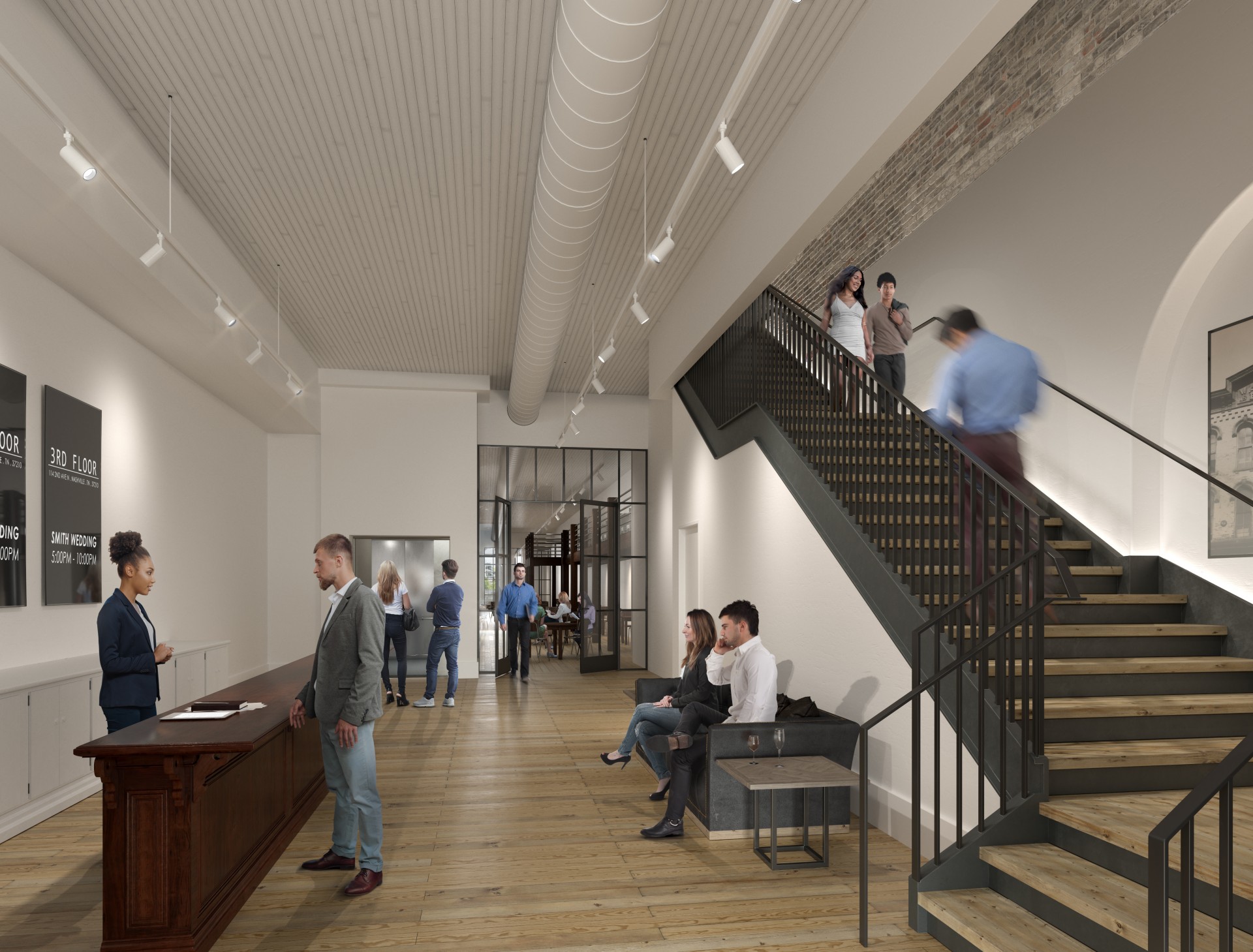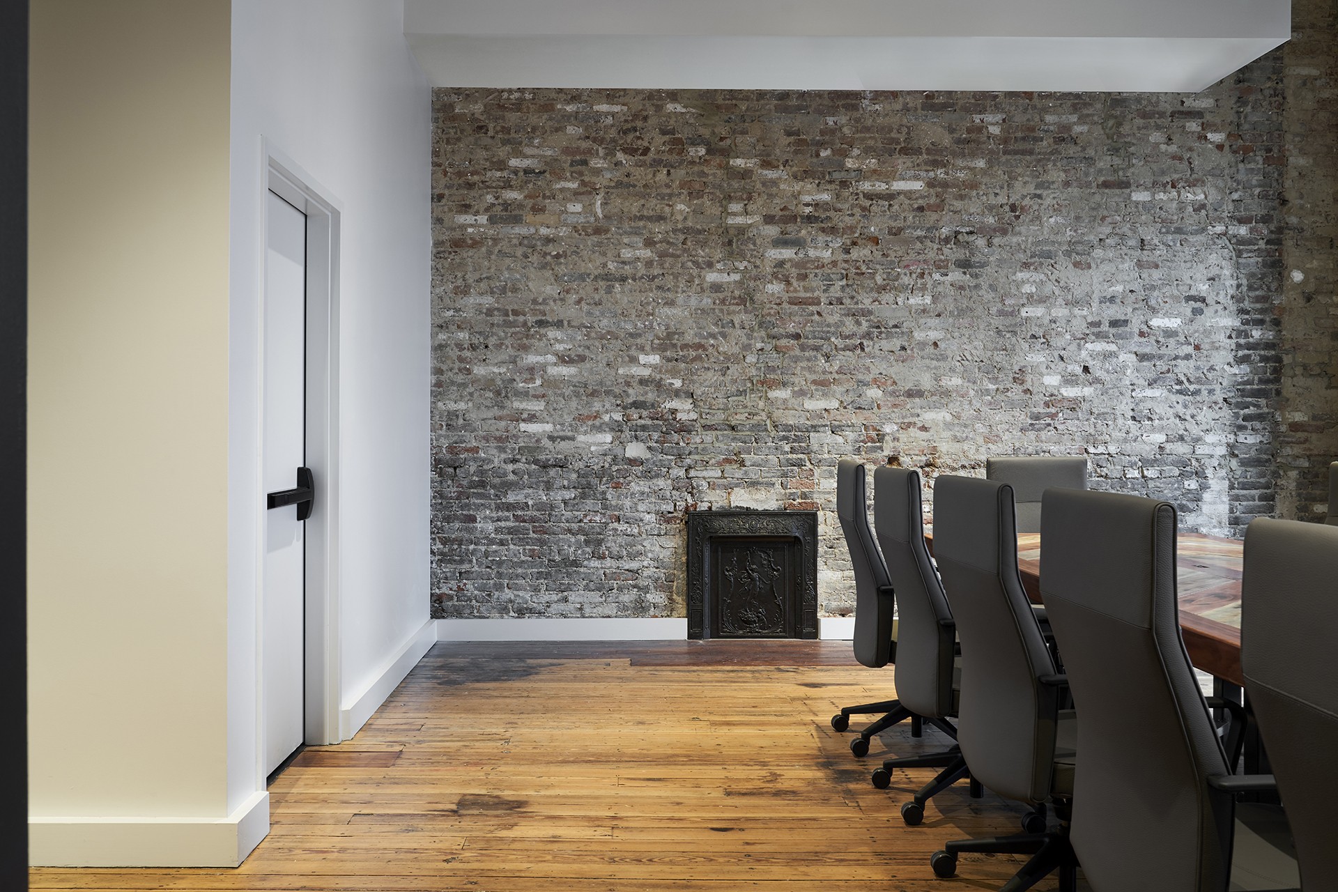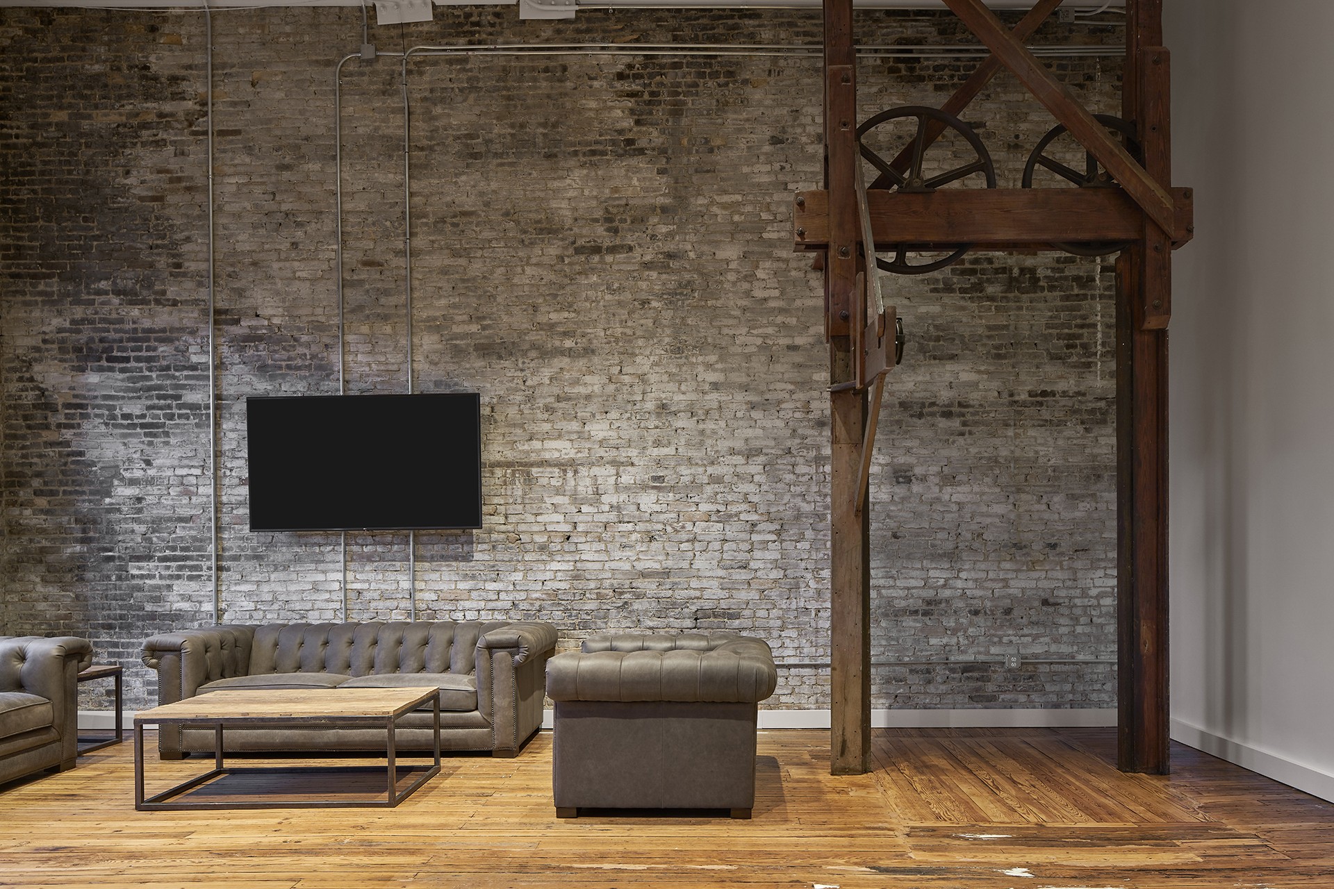 One Fourteen’s historic features include original tongue & groove floors, exposed timber floors joists, beadboard ceilings, exposed masonry party walls, two historic hoistways, and a vault originally used by the warehouse retailer. On the exterior, all historic window and building cornices were given a fresh coat of paint. The ground level was once again opened to the street with new 11’ tall stile & rail doors accompanied by historically respectful windows.