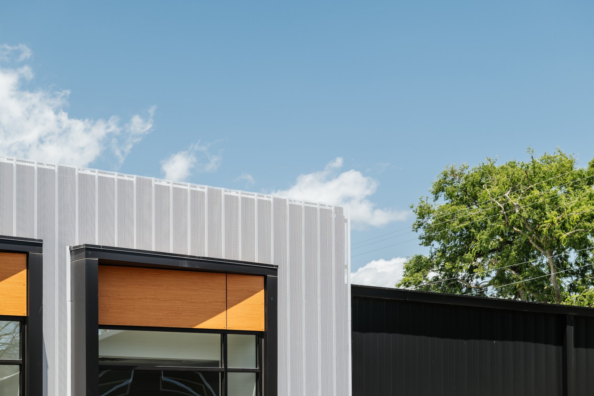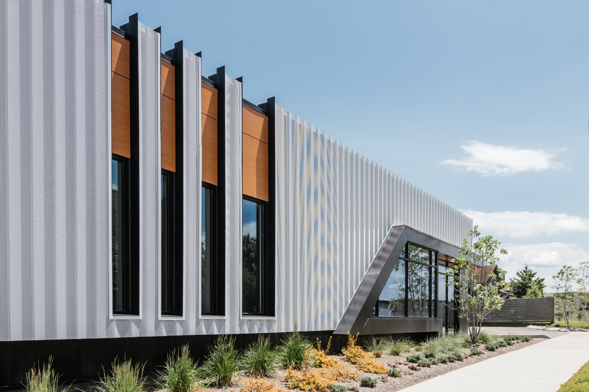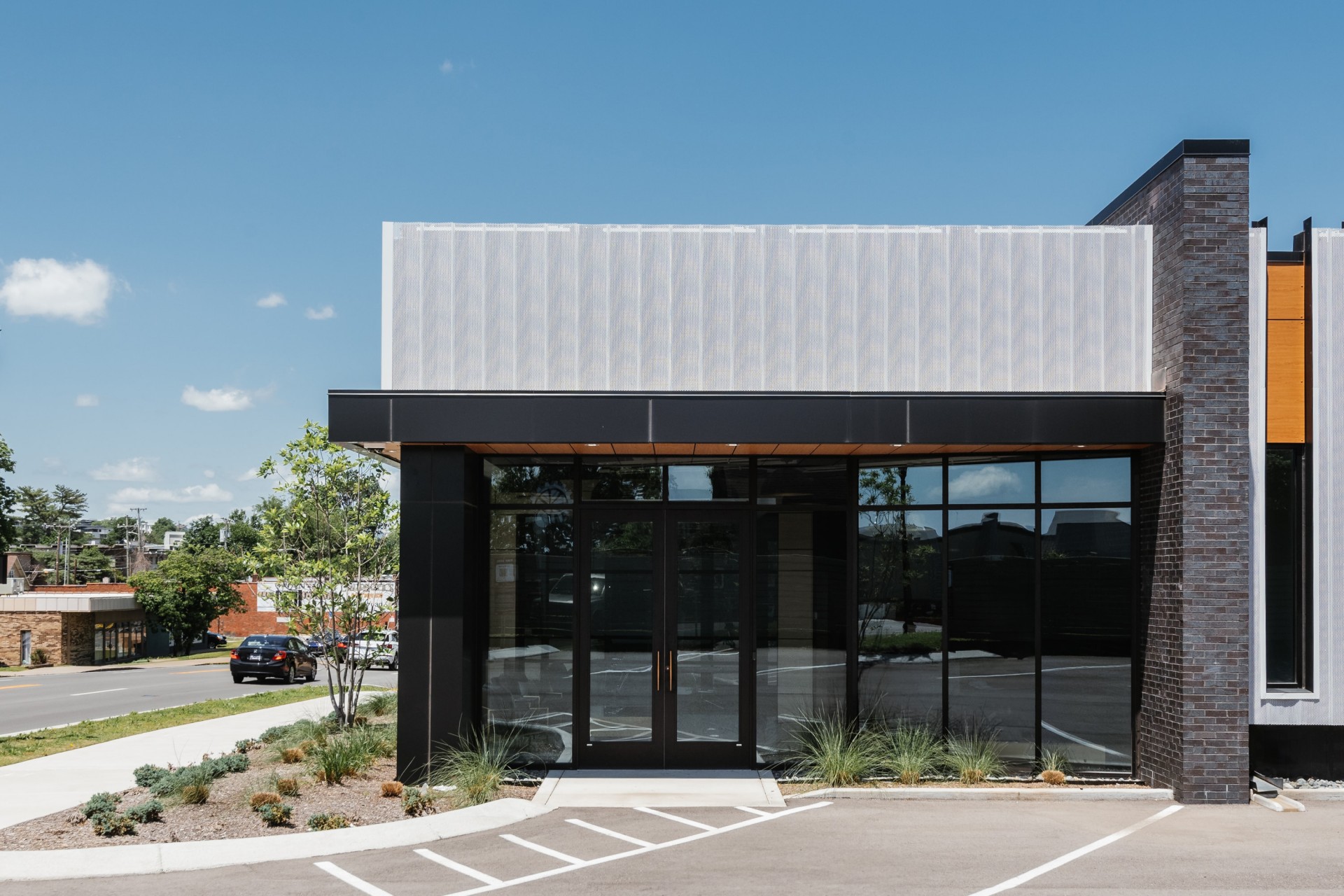 The owner desired an aesthetic that was both technical and elegant, speaking to the blend of highly couture yet highly technical work that will take place in the building. The design takes inspiration from not only the company’s work, but also the founder’s history, which involved the creation of high-tech robots and machines that are fleshed out (literally… think theme park animatronics) with a skin or tailored outer garment. The idea translated to the exterior of this building having multiple layers of “skin” that are pulled back or carved away in sections to reveal the endoskeleton of the building. The perforated screen wall that wraps a portion of the building is lit at night to purposely expose and accent the structure beyond, and each opening in the building is either carved away from the solid form, or playfully slips behind the screen to reinforce the layering affect. The interior continues this narrative, beginning at the moment of entry with directed vistas offering glimpses to where the magic is happening without totally giving it away. The brick monument wall extends from outside to inside, blurring the lines of exterior and interior, while a wooden feature wall draws the eye along a visual path throughout the space, eventually connecting to the R+D lab and prototyping machine shop. Materials include industrial steel, and textured masonry, and highly refined wood and brass details, all intentionally juxtaposed to further the architectural symbolism.