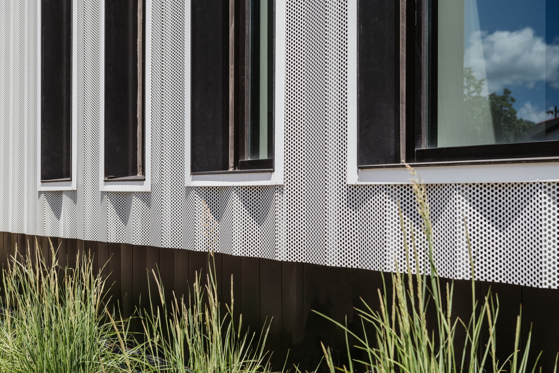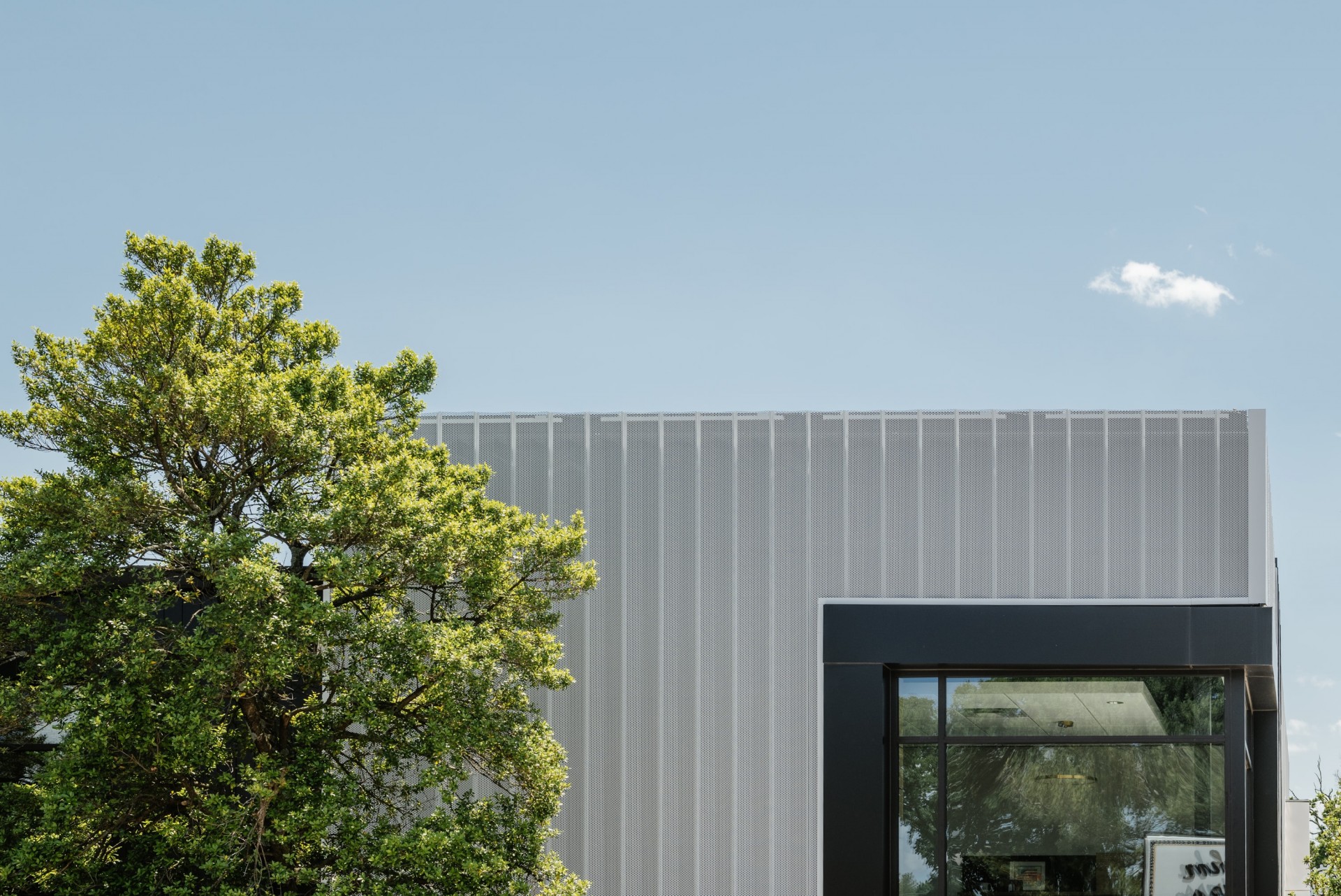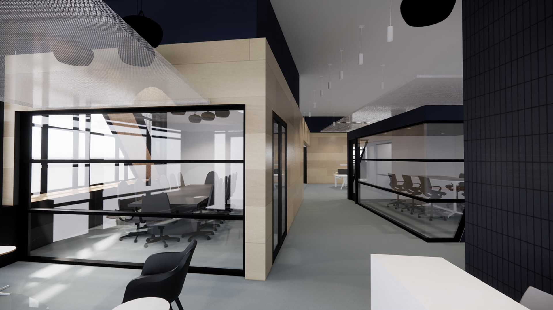 The owner desired an aesthetic that was both technical and elegant, speaking to the blend of highly couture yet highly technical work that will take place in the building. The design takes inspiration from not only the company’s work, but also the founder’s history, which involved the creation of high-tech robots and machines that are fleshed out (literally… think theme park animatronics) with a skin or tailored outer garment. The idea translated to the exterior of this building having multiple layers of “skin” that are pulled back or carved away in sections to reveal the endoskeleton of the building. The perforated screen wall that wraps a portion of the building is lit at night to purposely expose and accent the structure beyond, and each opening in the building is either carved away from the solid form, or playfully slips behind the screen to reinforce the layering affect. The interior continues this narrative, beginning at the moment of entry with directed vistas offering glimpses to where the magic is happening without totally giving it away. The brick monument wall extends from outside to inside, blurring the lines of exterior and interior, while a wooden feature wall draws the eye along a visual path throughout the space, eventually connecting to the R+D lab and prototyping machine shop. Materials include industrial steel, and textured masonry, and highly refined wood and brass details, all intentionally juxtaposed to further the architectural symbolism.