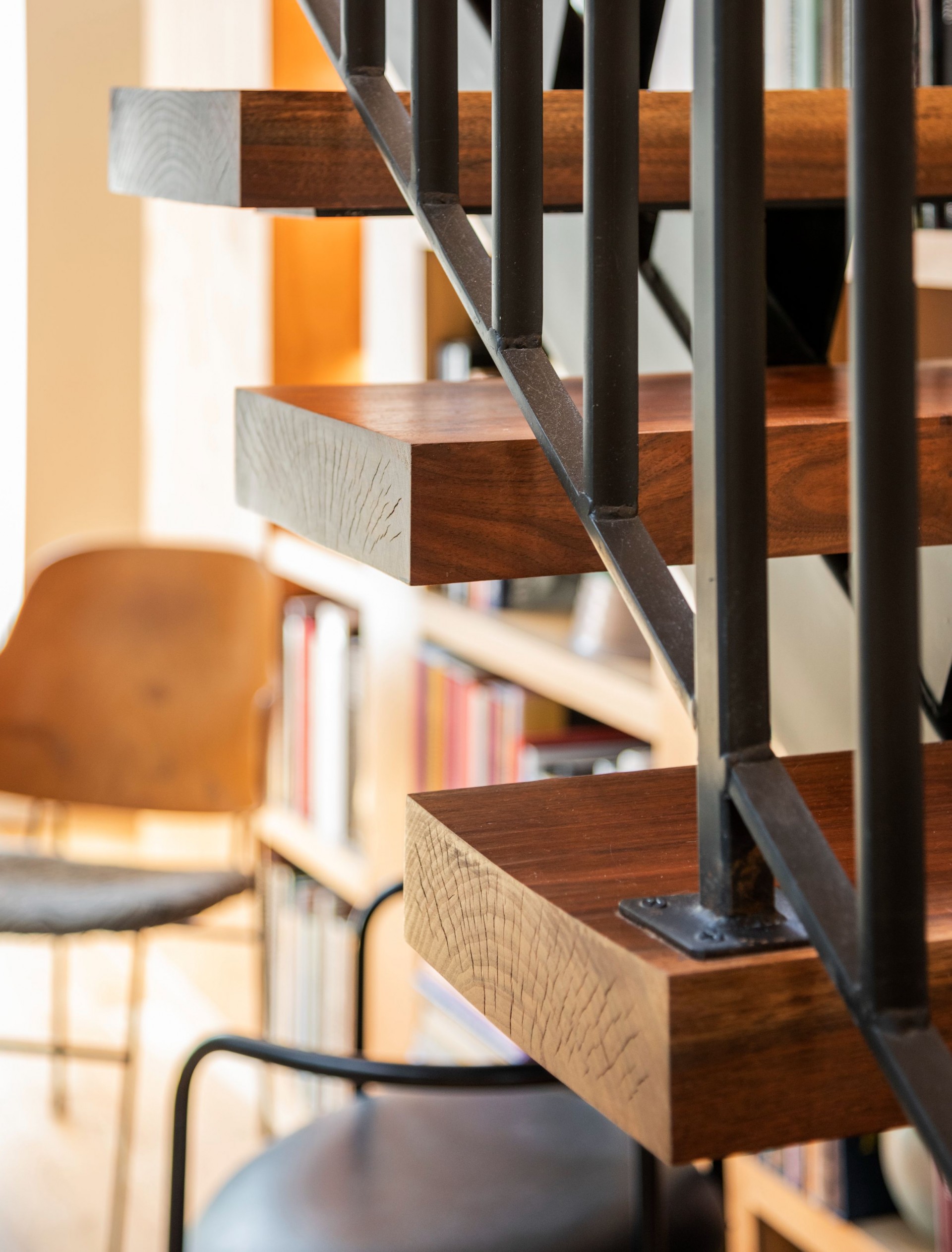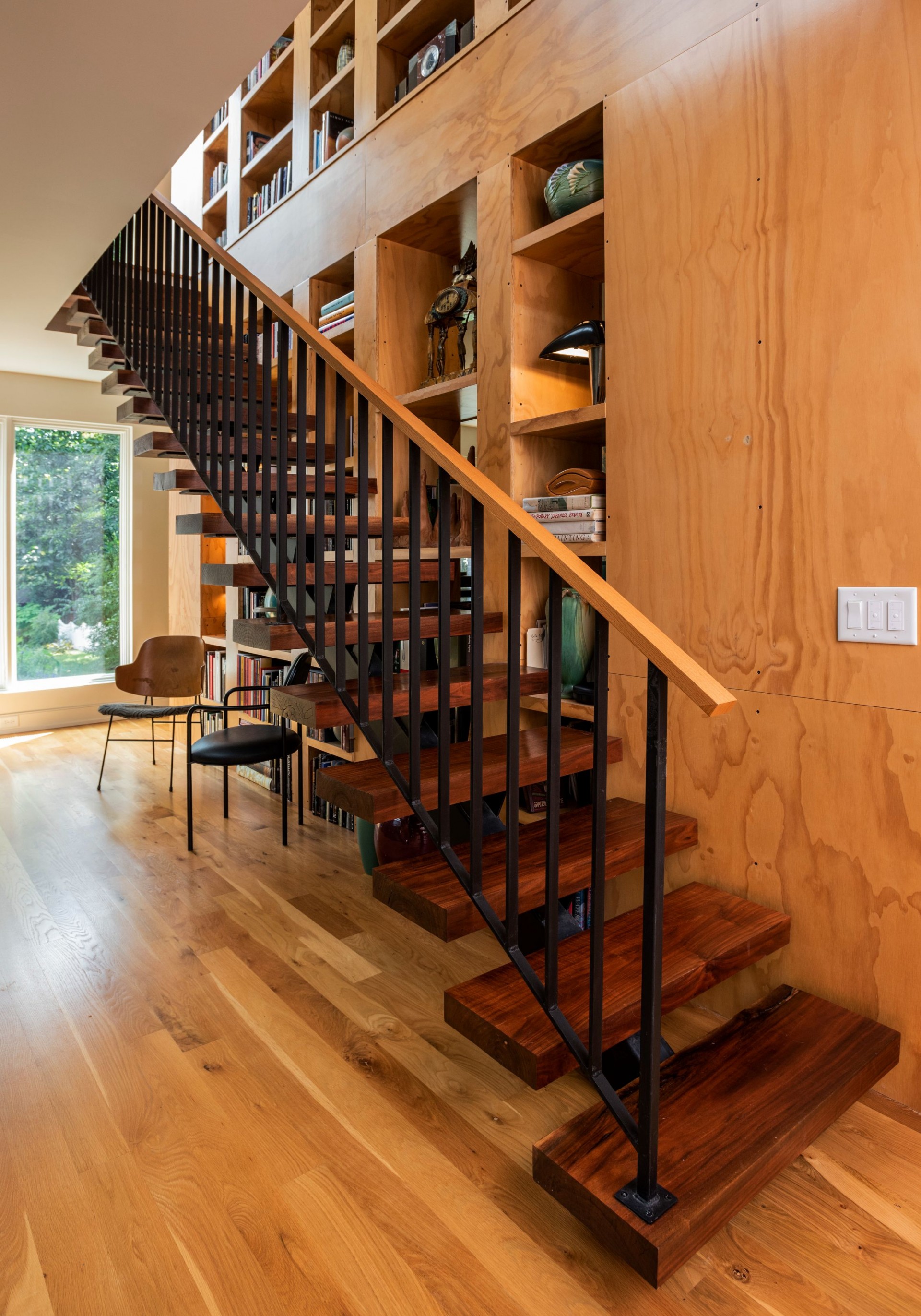 The interior is a surprise upon first entry. The home is organized around a central outdoor courtyard containing a highly curated moss garden. The two-story, fully glass courtyard allows natural light to flood every part of the home from the interior, while maintaining privacy and furthering a connection to nature via the green carpet of varying mosses. The homeowner’s collection of art, furniture, and artifacts from their travels across the world fill the museum-like walls of the home. Walnut wood accents, such as the fireplace surround, the entry closet doors, and the floating slab stair treads, are all hand made from the large walnut tree that was removed from the site prior to construction - another connection both to nature and the surrounding history of the site. The floating staircase runs adjacent to the moss garden courtyard, and is further flanked by a two-story, double-sided bookcase wall, which serves as a feature piece for display of art and the owner’s extensive collection of books, and is visible through the glass from all sides of the courtyard.