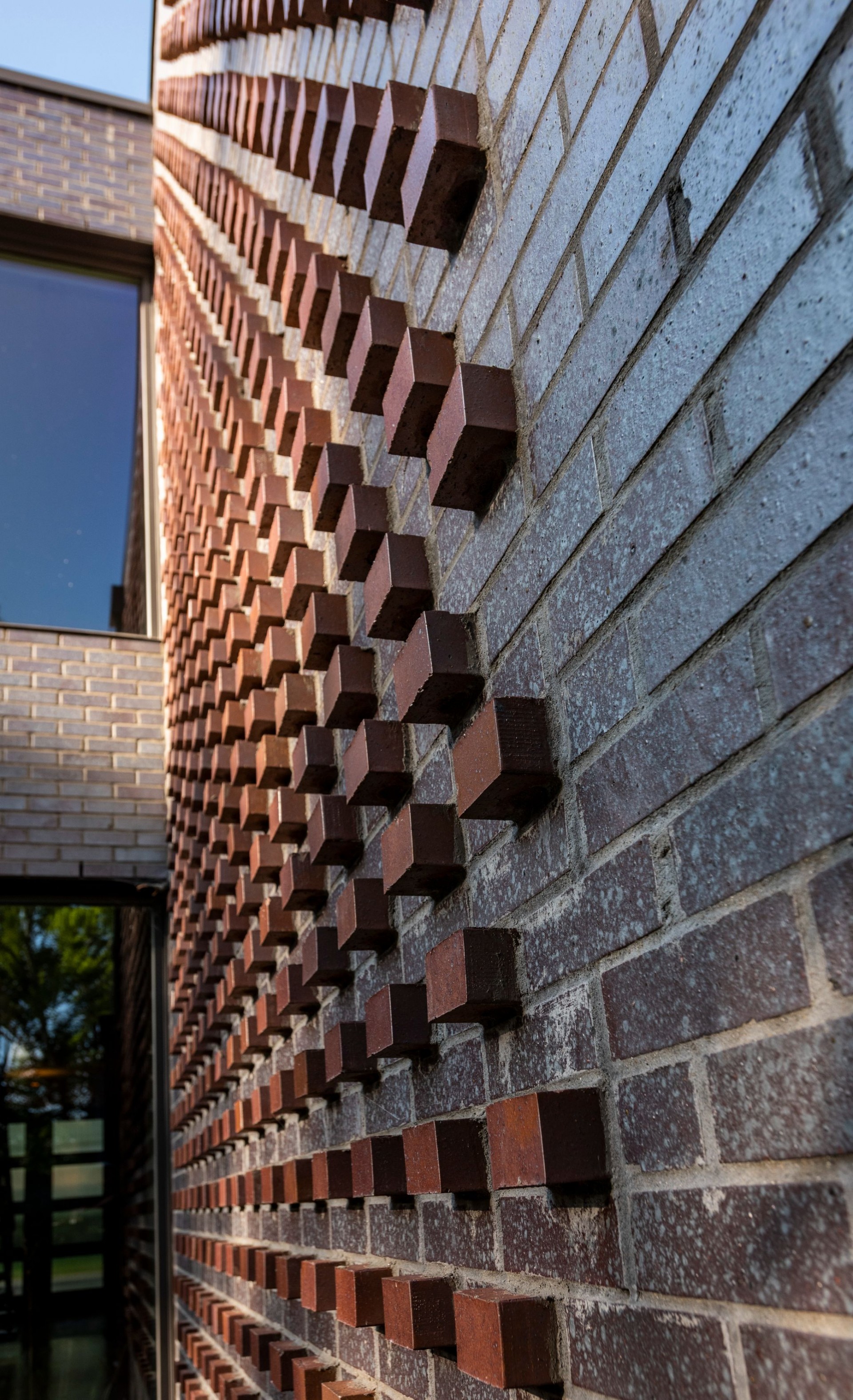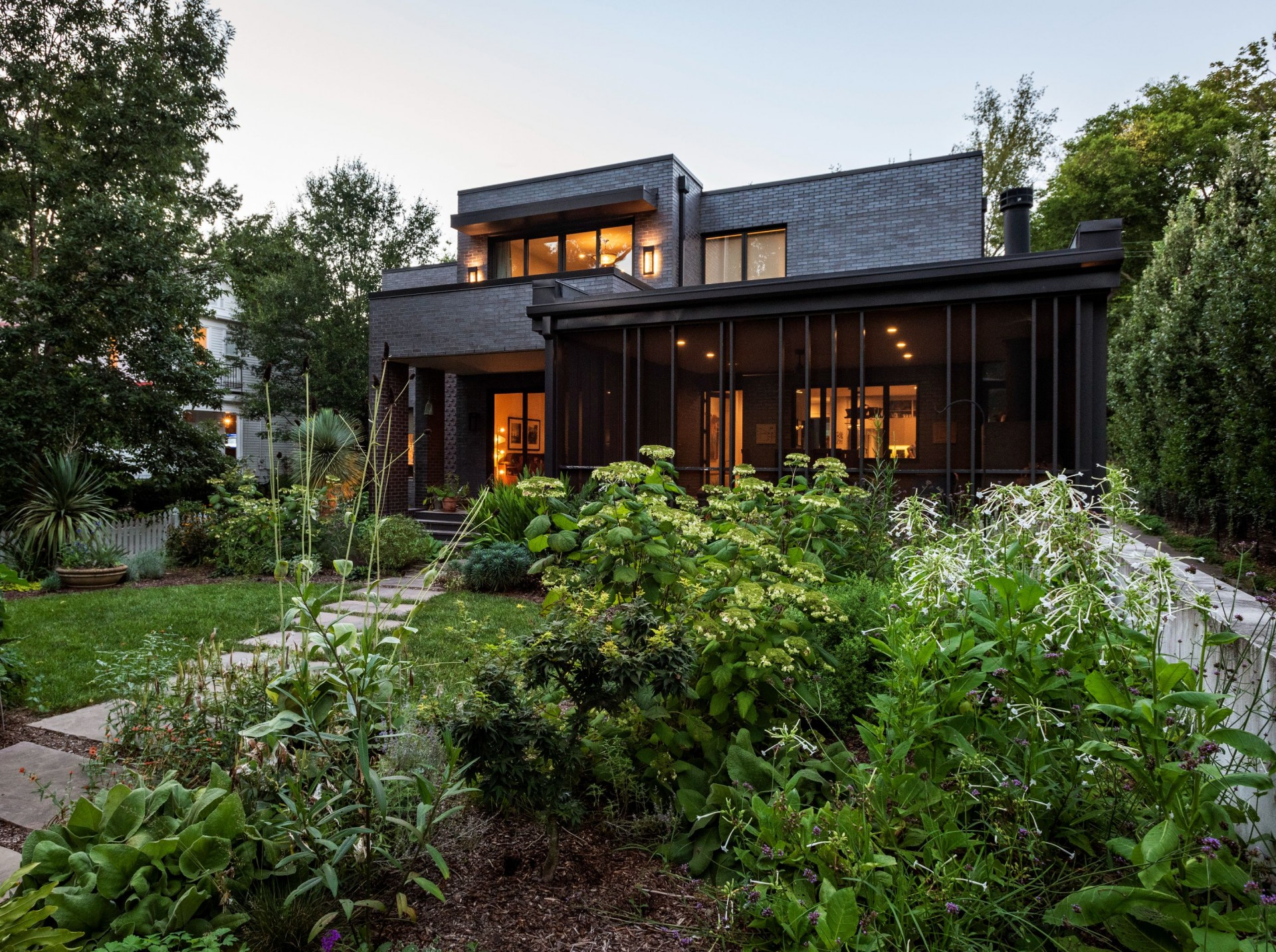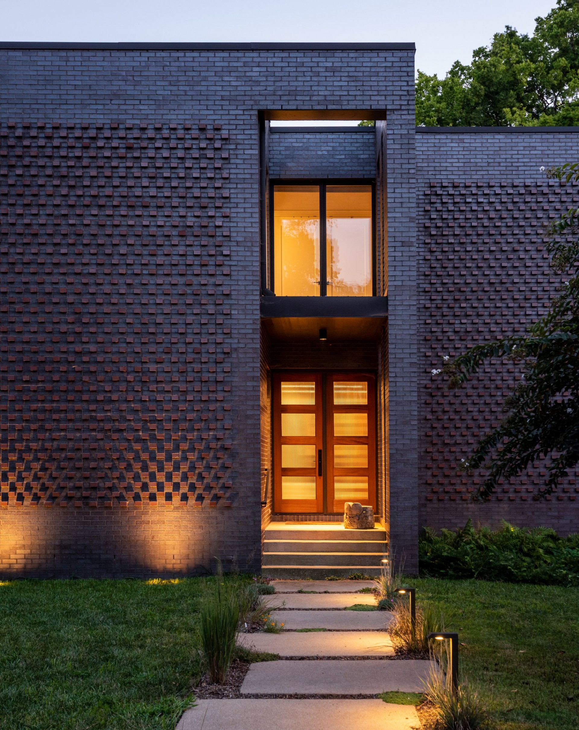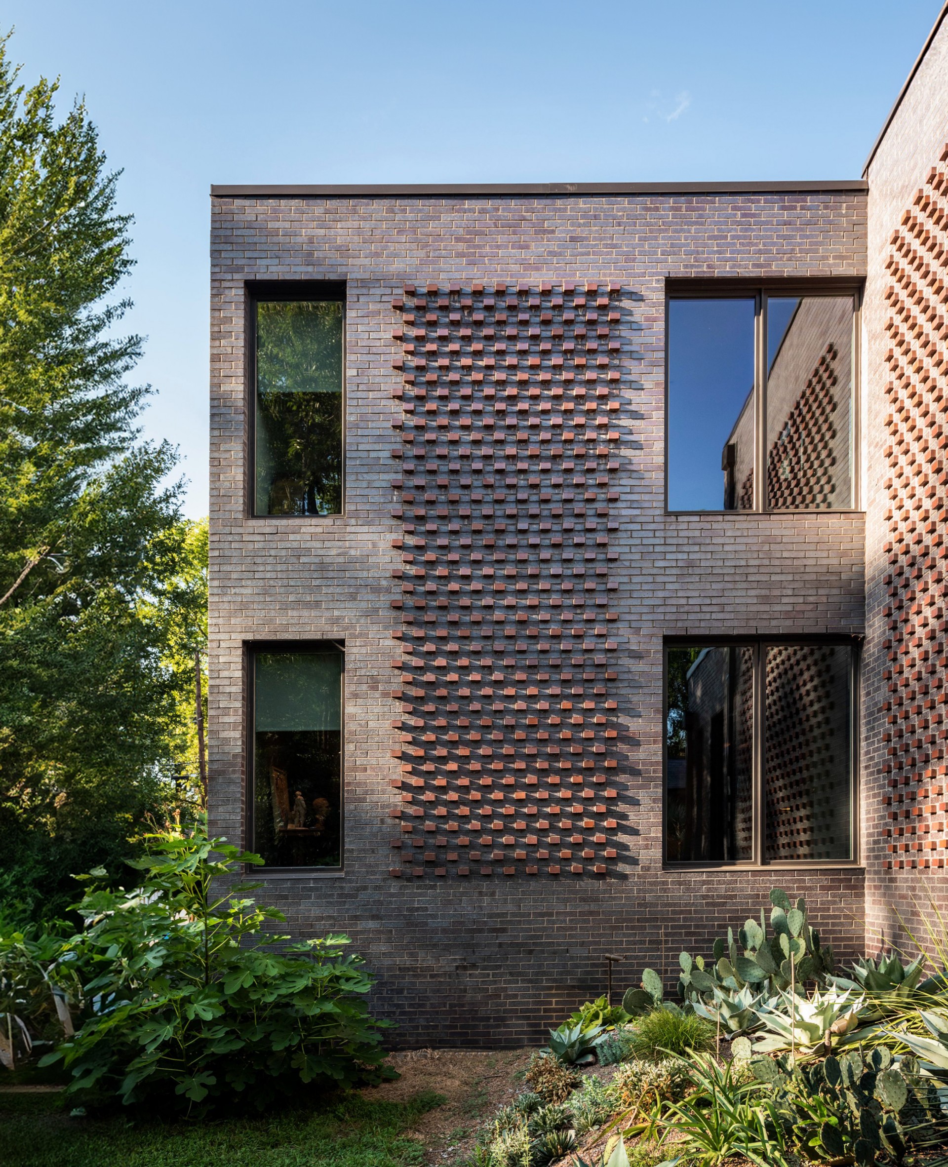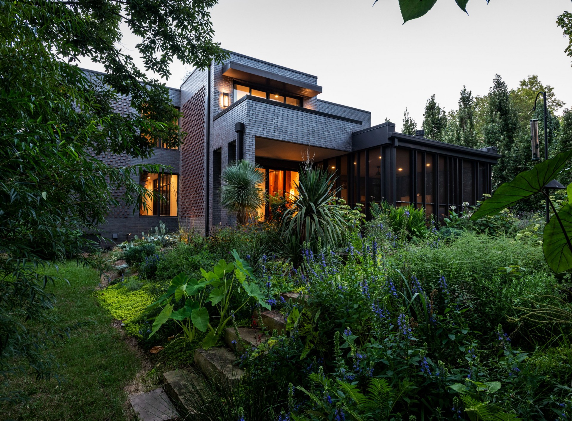 In collaboration with Coleman Coker/Building Studio, this 3600sf single-family residence with detached 625sf artist’s studio combines contextual scale with modern form to create a neighborhood home for a couple entering the second part of their lives together. The home was envisioned from the beginning as a metaphor for the client’s personalities: professional and somewhat reserved on the exterior, but surprisingly outgoing once you find your way inside. The site was a formerly undeveloped lot in an established neighborhood, with two of the oldest and more traditional homes on either side. The form of the home is deliberately scaled to mimic the massing of the two neighboring homes, while deliberately departing from the traditional pattern to impart a building both of its time and reflecting the artistic interests of the homeowners. The dark brick is intended to complement and merge into the green landscape surrounds, and the brick detailing on the blank exterior walls displays a level of detail and craftmanship. Placement of solid and void were a deliberate balance of privacy versus connections to nature. The clients love of gardening and exotic landscape was given room to explore and surround the minimalist form with lush green landscapes.