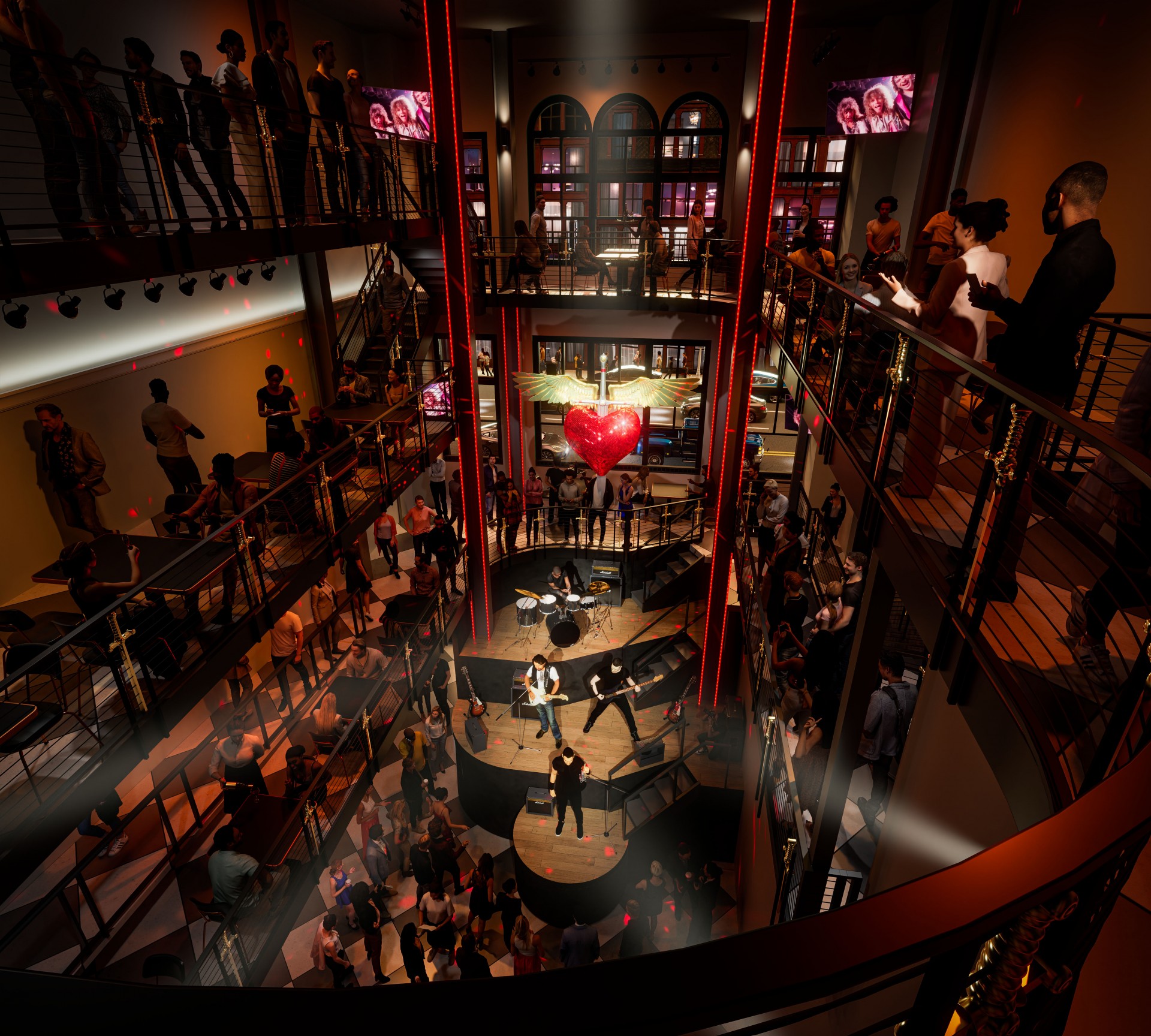 The design consists of a 5-story honky tonk centered around the career of a renowned music artist. Roof decks on both 4th and Broadway set the building back to reduce the scale along both streets. The materiality creates entry features and signage that will be unique along this stretch of lower Broadway. The interior includes multiple catwalks for viewing world class music performances, a large 3 story open space along the Broadway façade, and spaces that allow for events to occur simultaneously as a music performance.