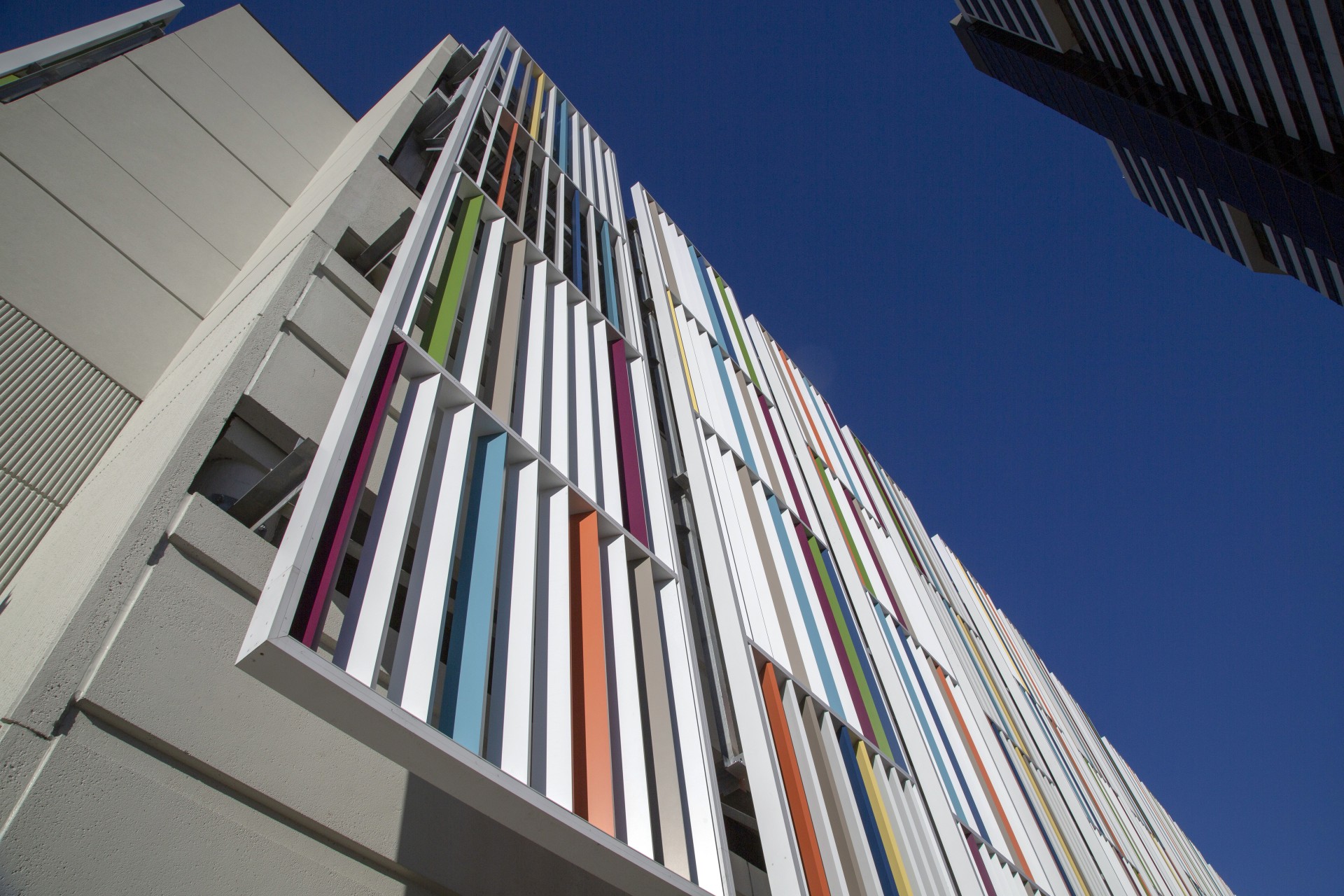 The completed design has seven tiers of parking, a new MRL elevator, new stair towers, and a steel-framed garage added on top of an existing concrete framed structure. In order to tie the aesthetics of the old and new halves of the building together – while still carefully minimizing weight and cost – we added a visual screen to the building made