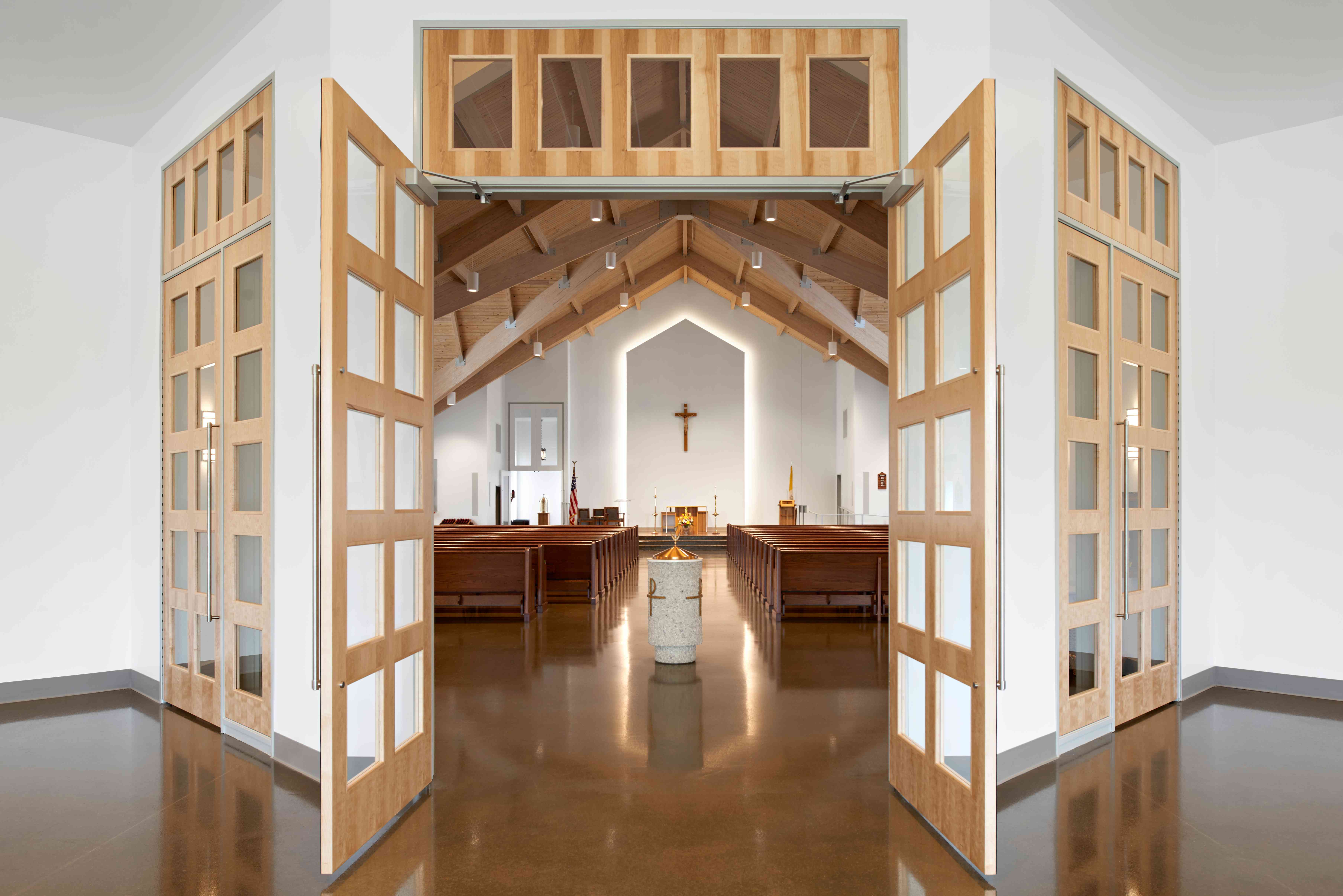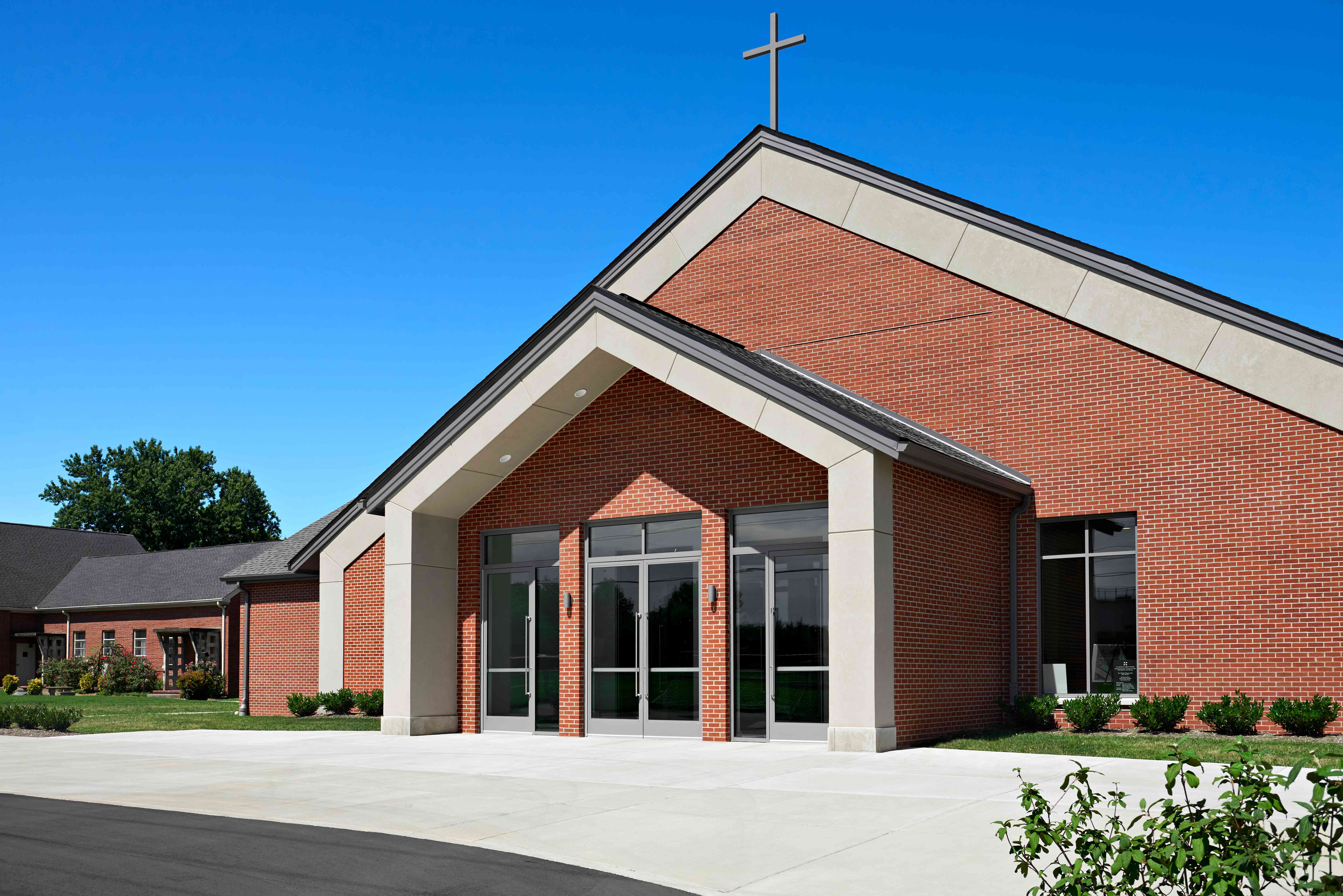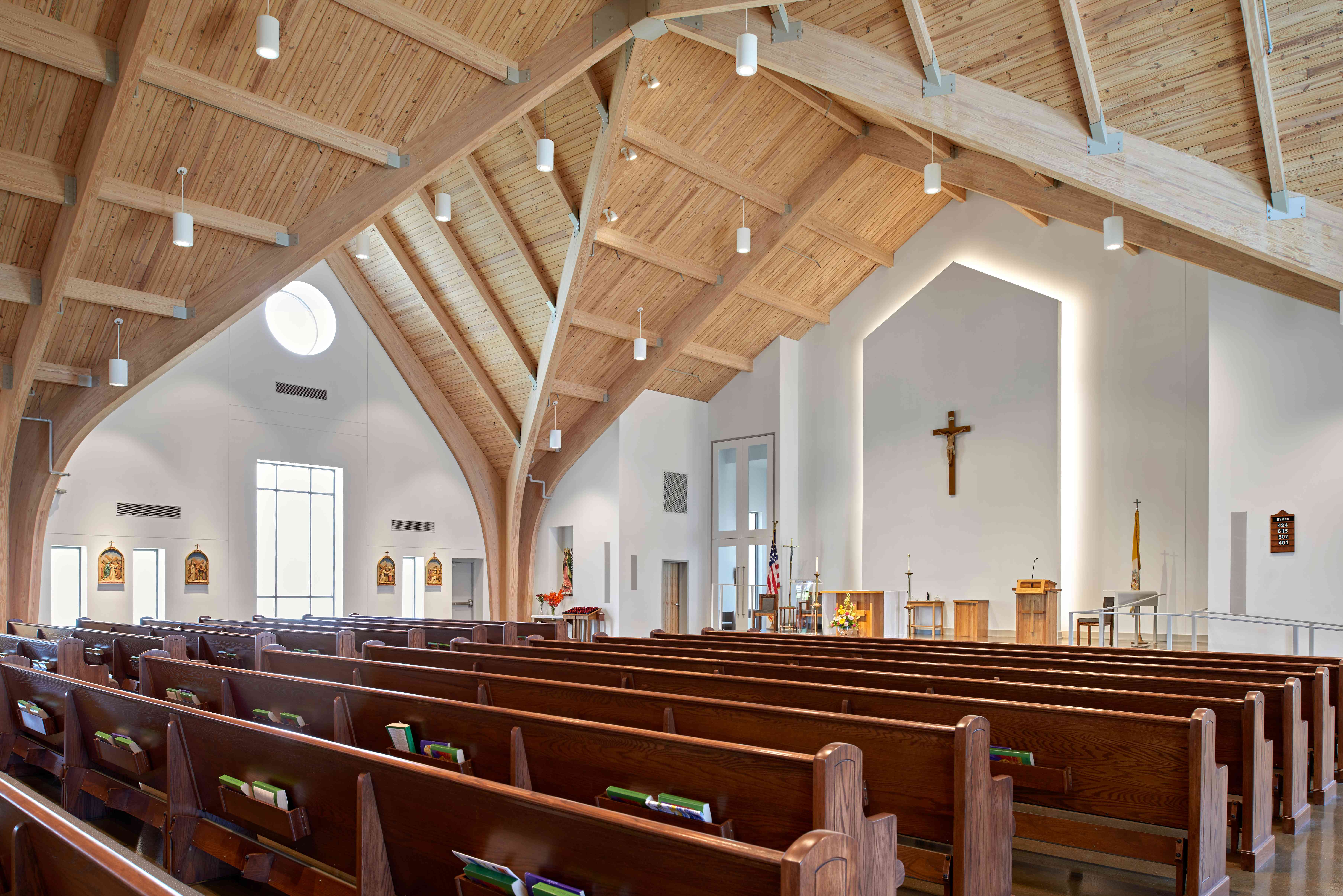 The new sanctuary seats 425 with room for expansion for approximately 200. A new entry plaza, parking lot, vesting, sacristy, bride’s room, cry room, choir riser area and storage also have been incorporated.