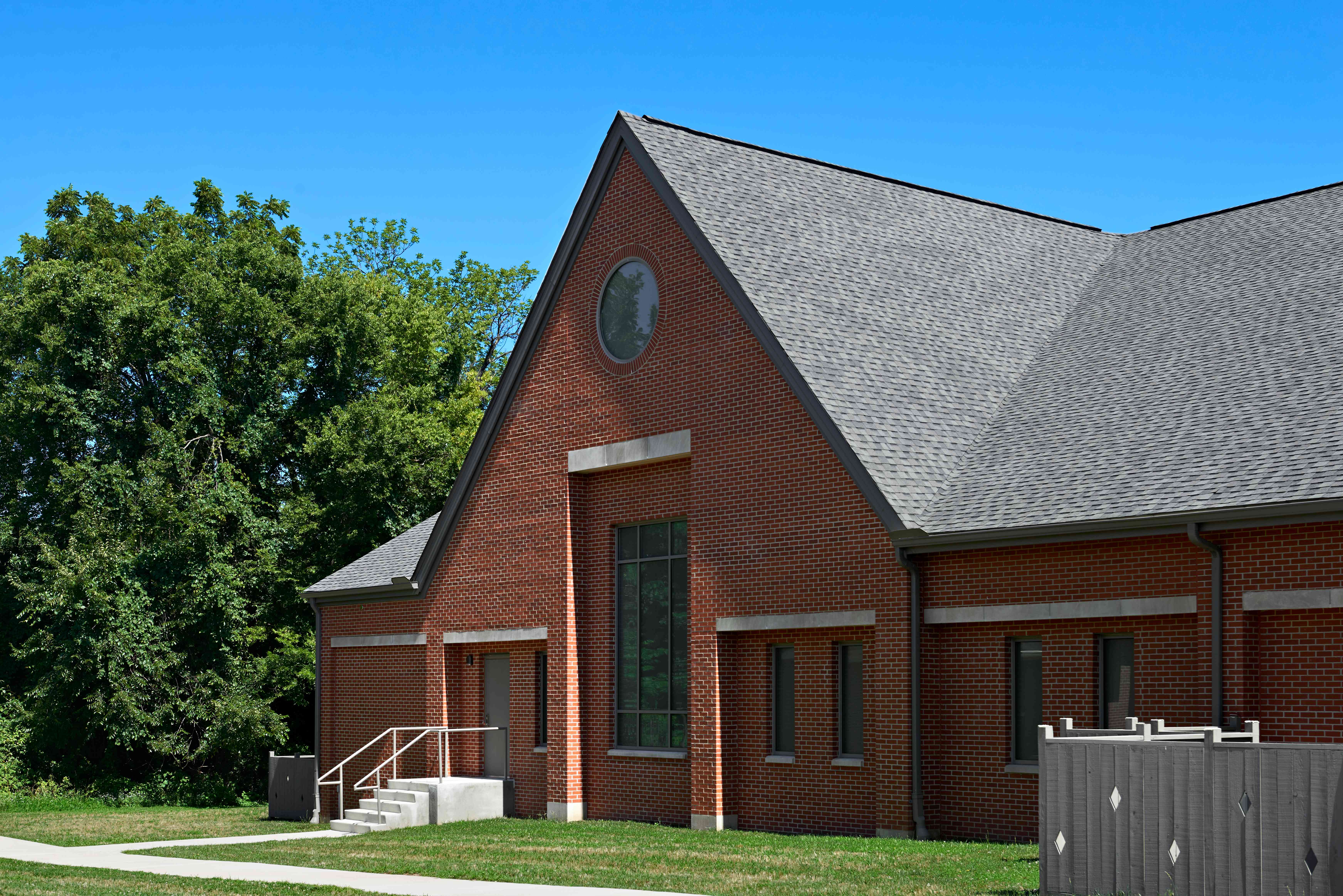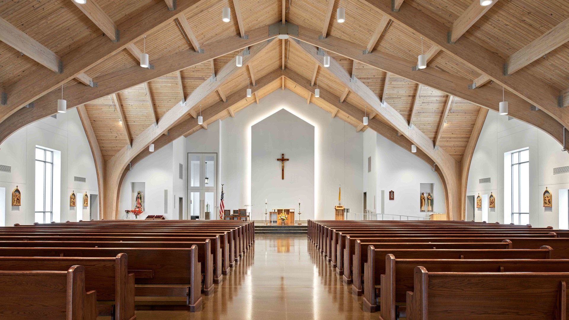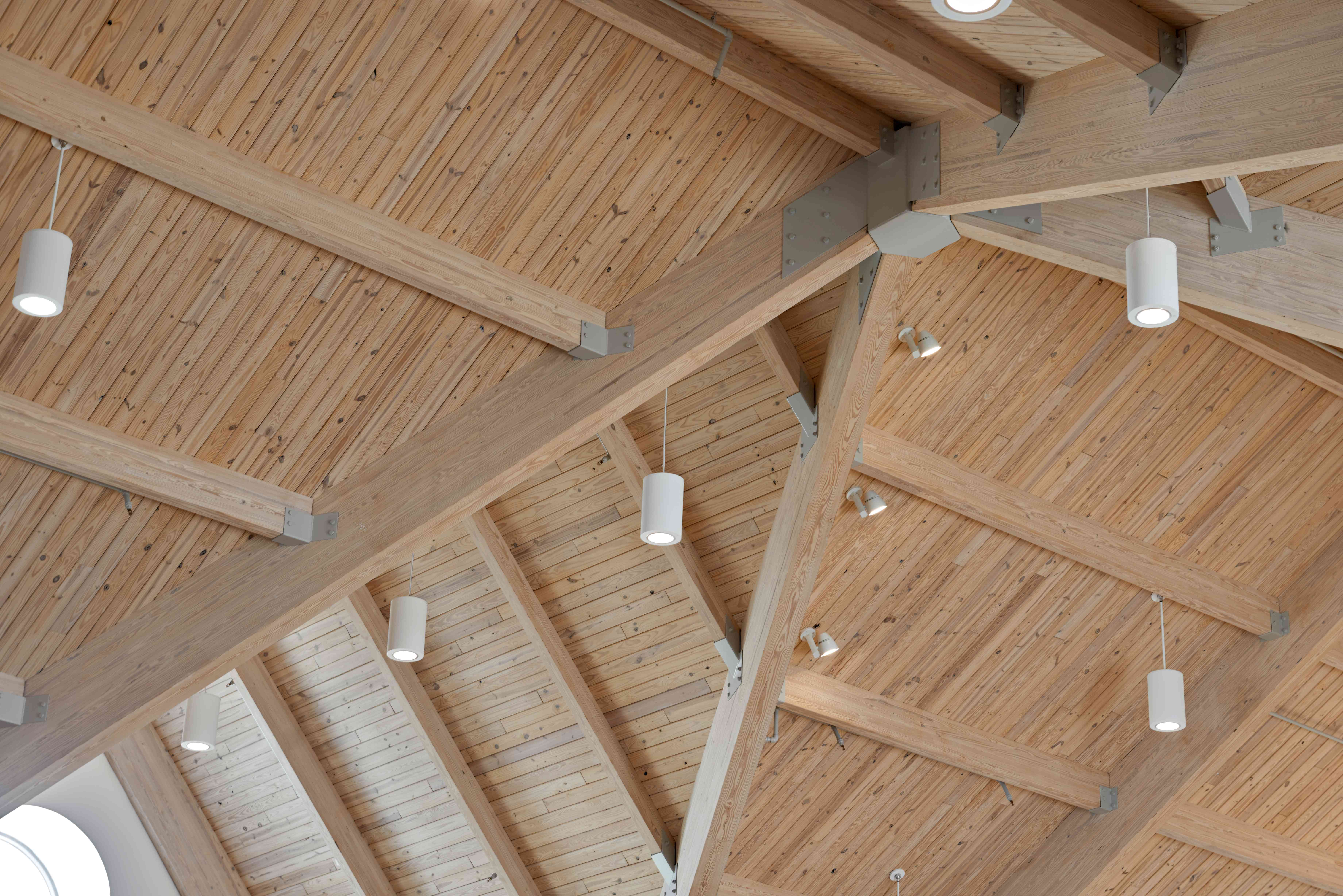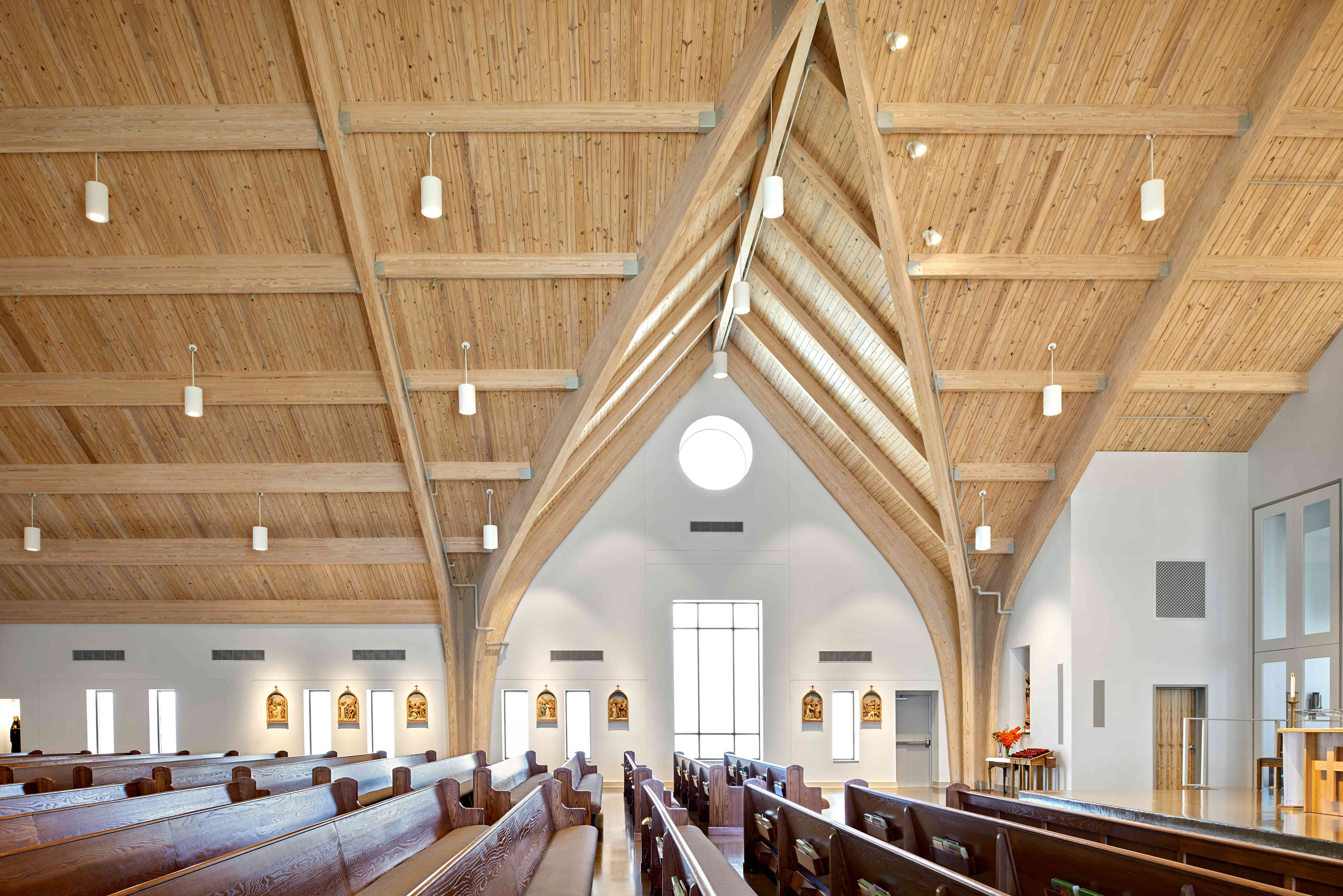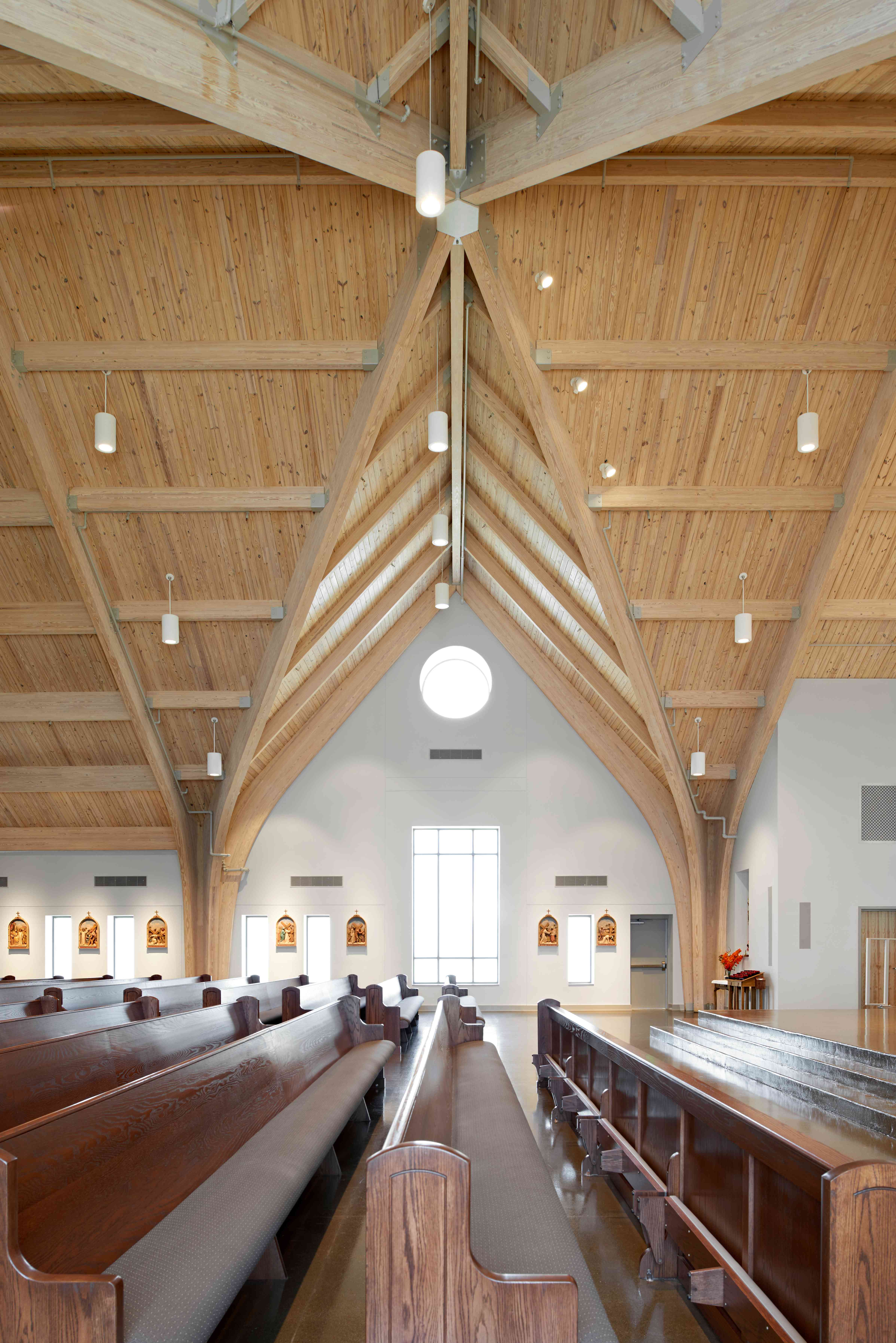 The structural system encompasses wood glue laminated arches with polished concrete floors and wood decking at the ceiling - all timeless materials. The windows have been designed to accommodate stained glass in the future and a new system of sidewalks will be incorporated to connect all areas on the site. Their current sanctuary on the same site will be repurposed into a Fellowship Hall.