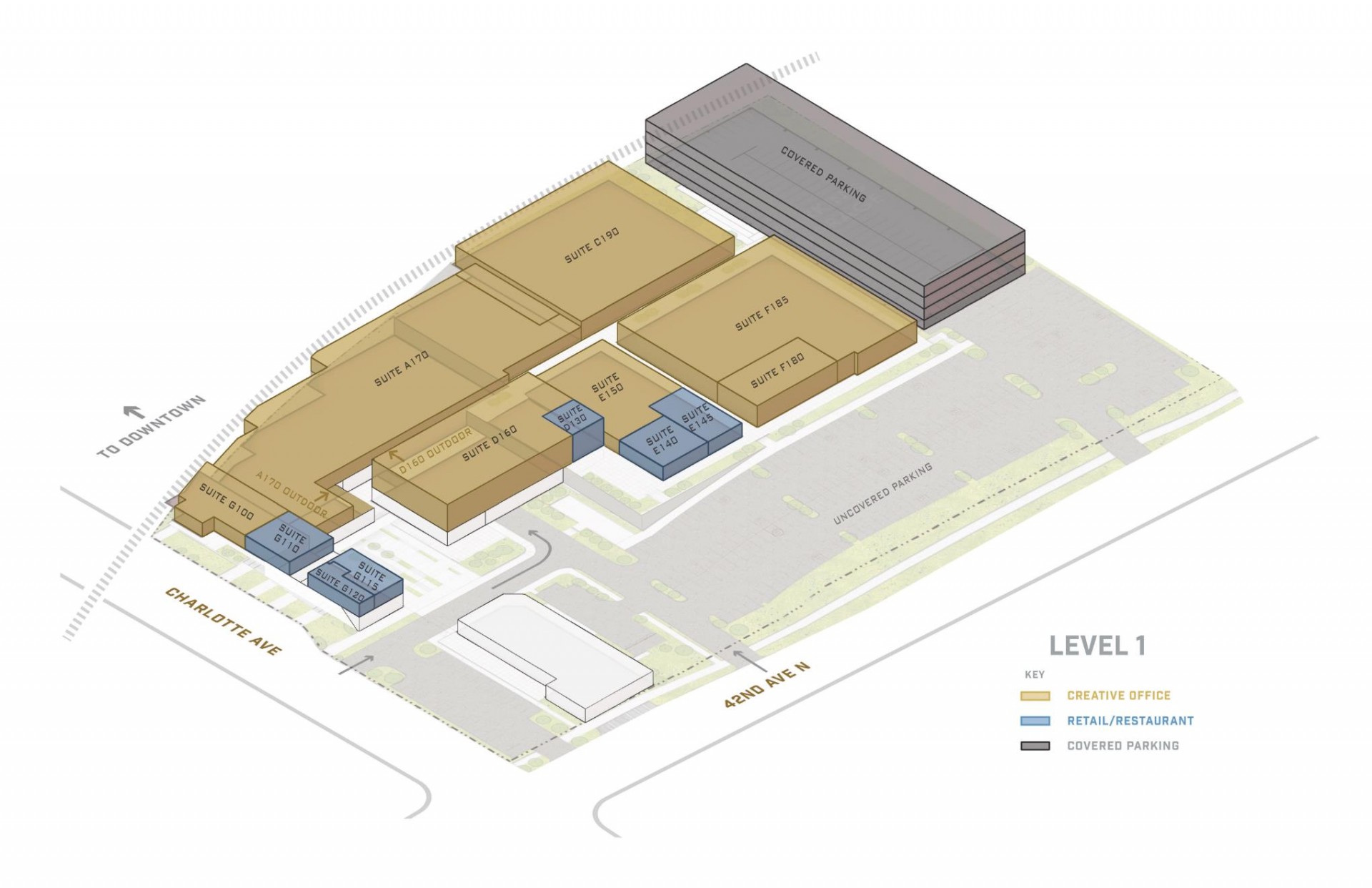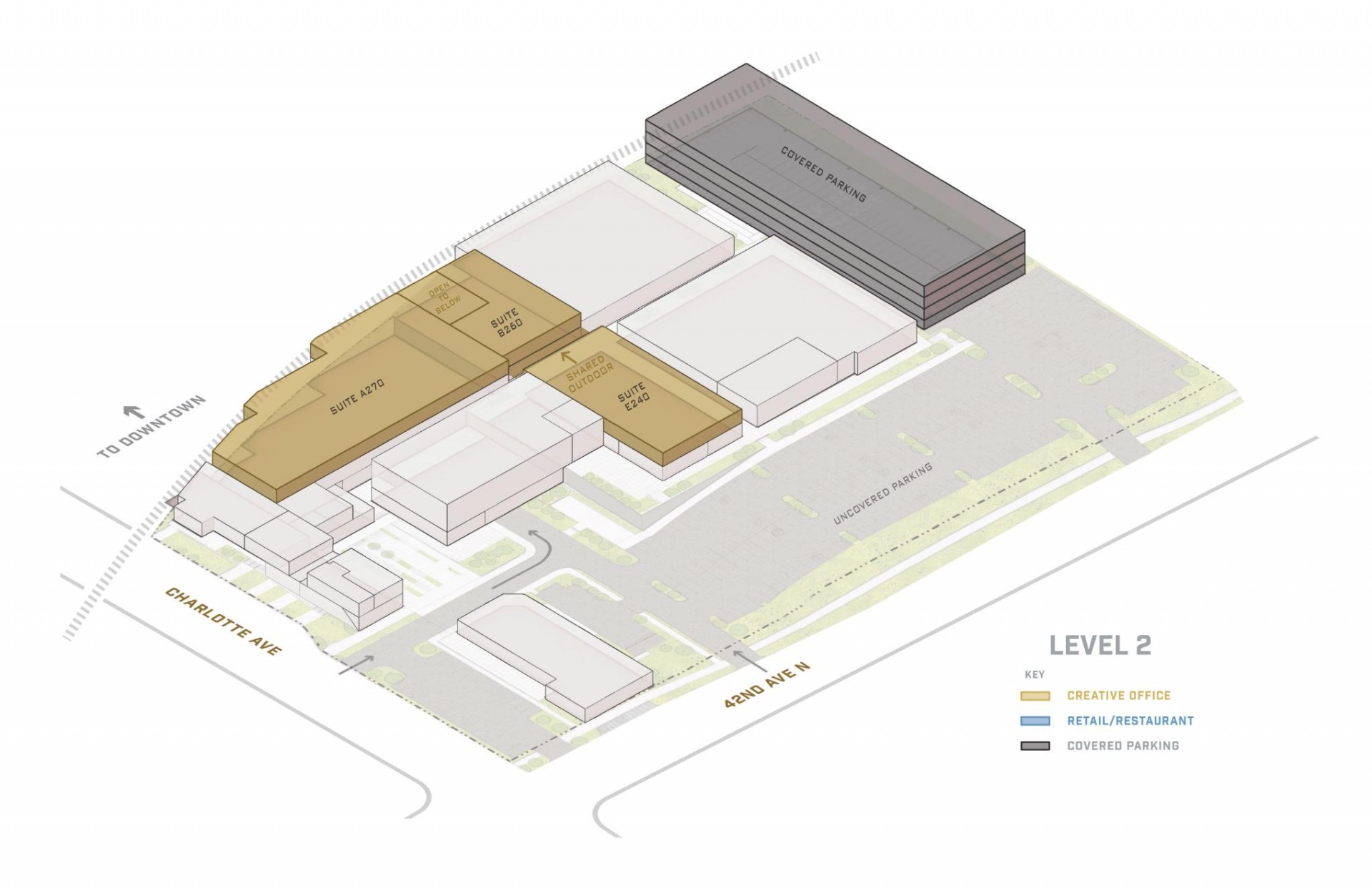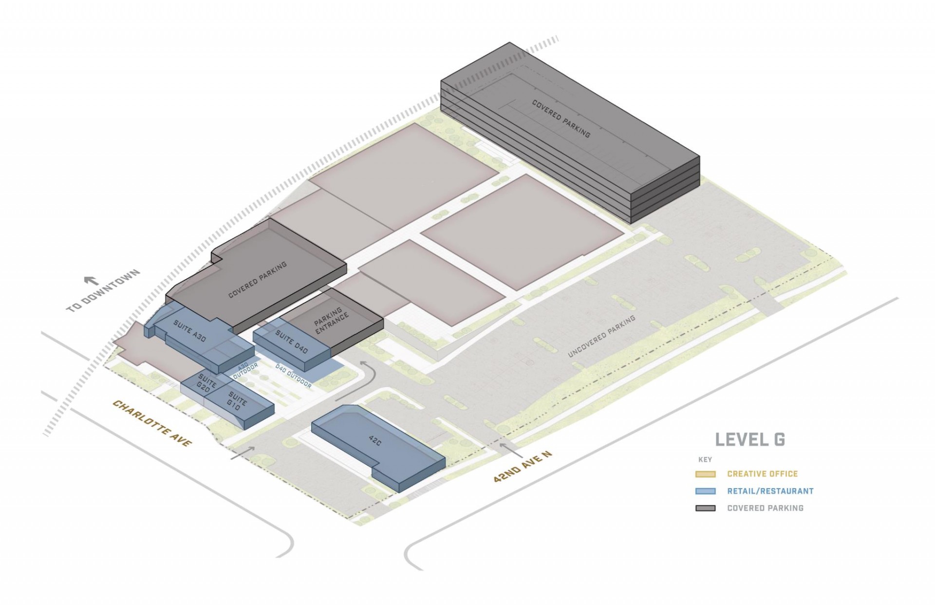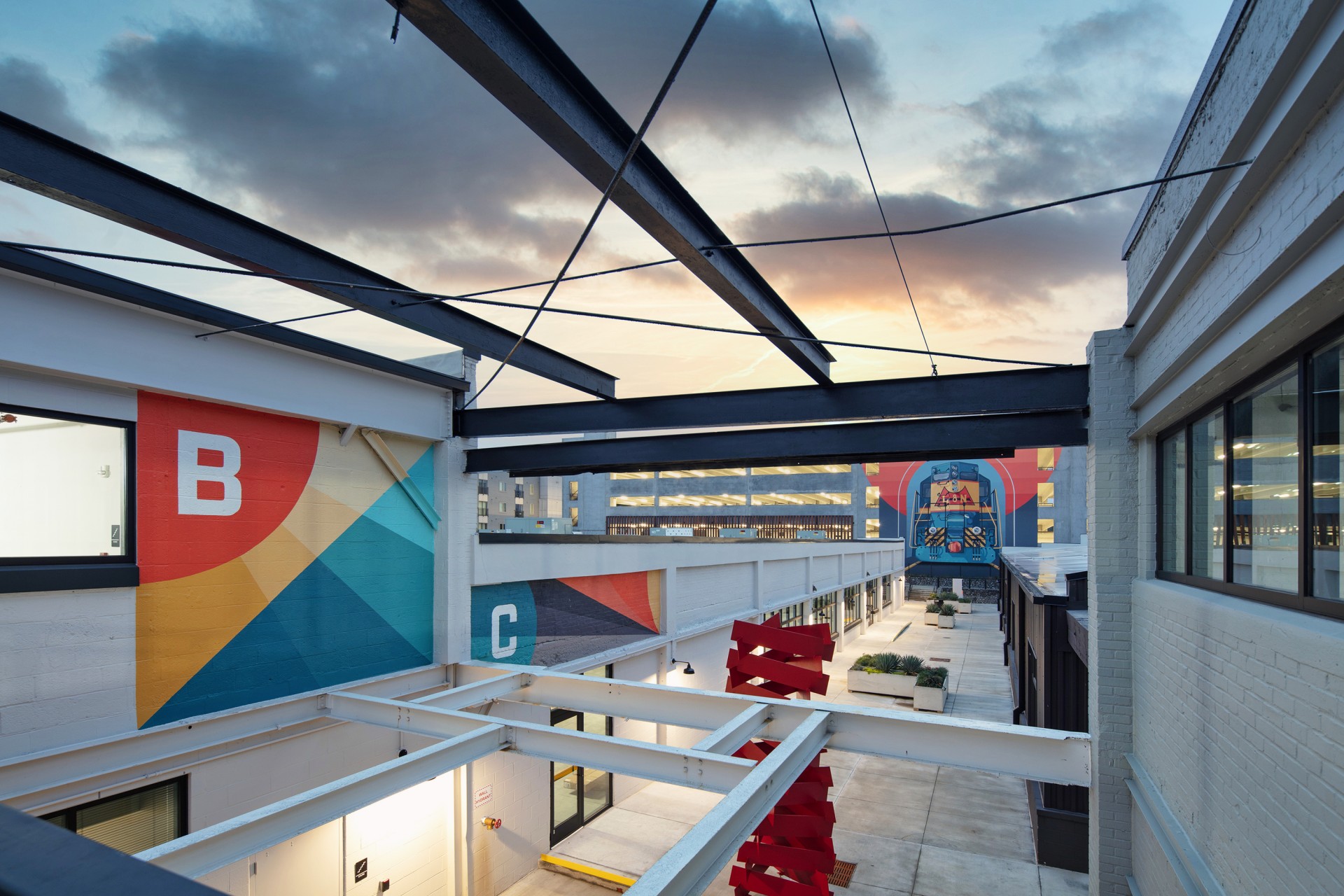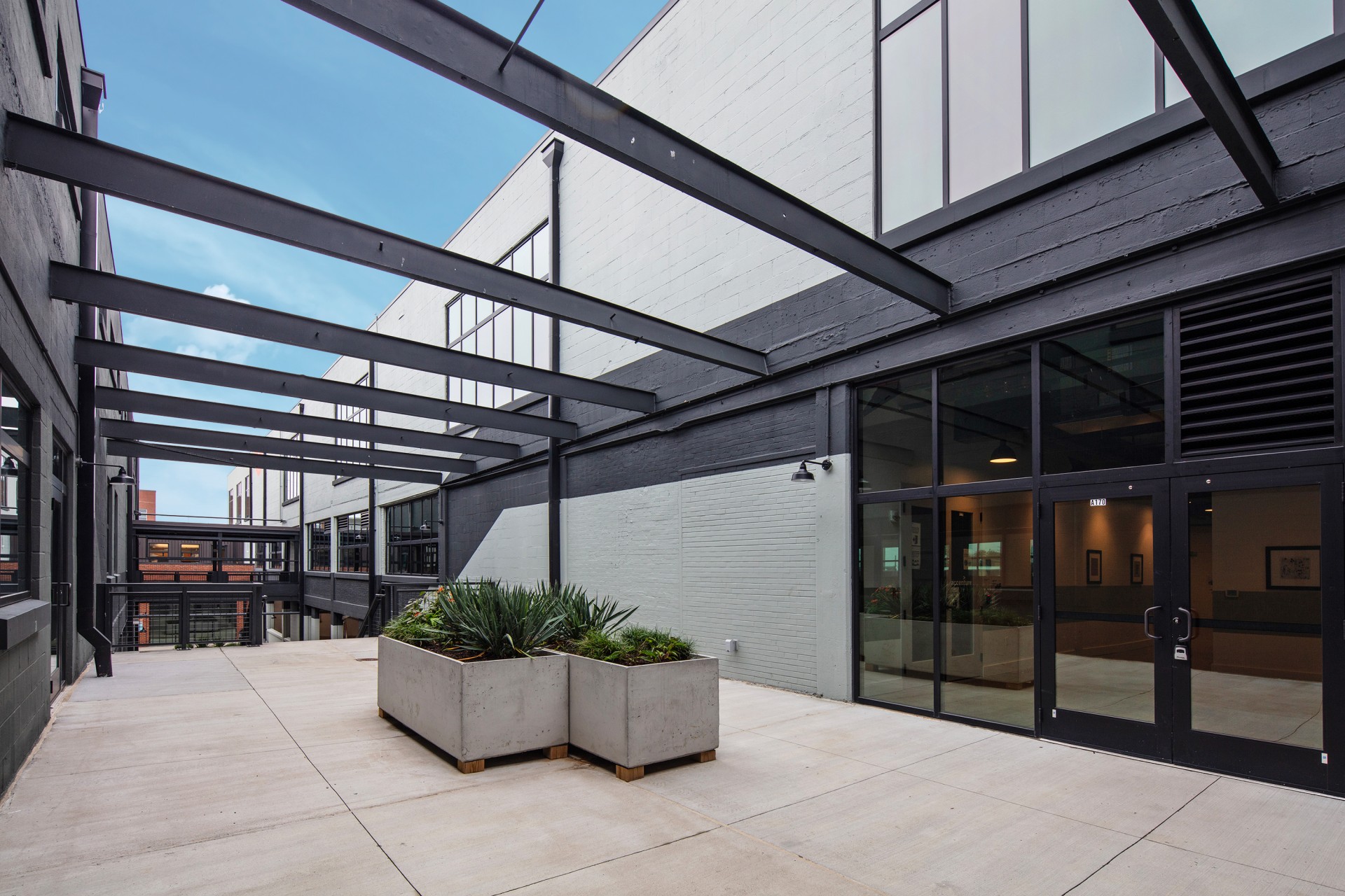 A new presence on Charlotte Ave will be created by a grand staircase leading to a commercial breezeway allowing views to the courtyard beyond. High ceilings, open steel and concrete structures, and masonry walls make for structures very difficult to replicate with new construction. They are wonderful assets to Nashville and will be celebrated throughout the design.