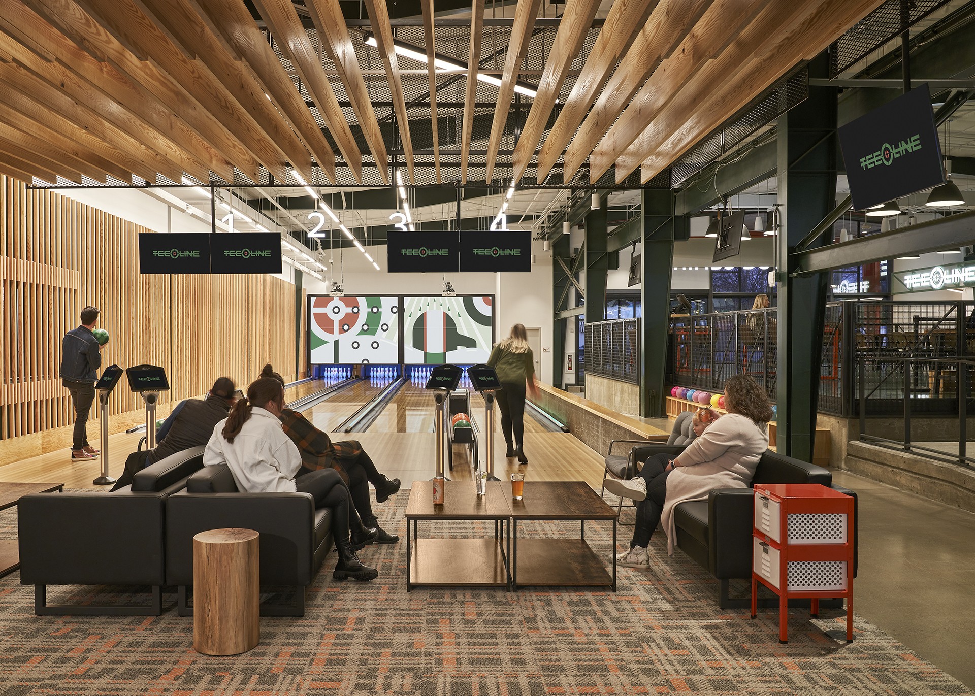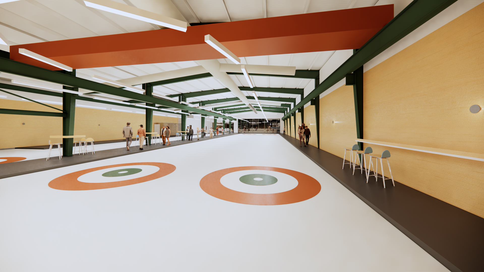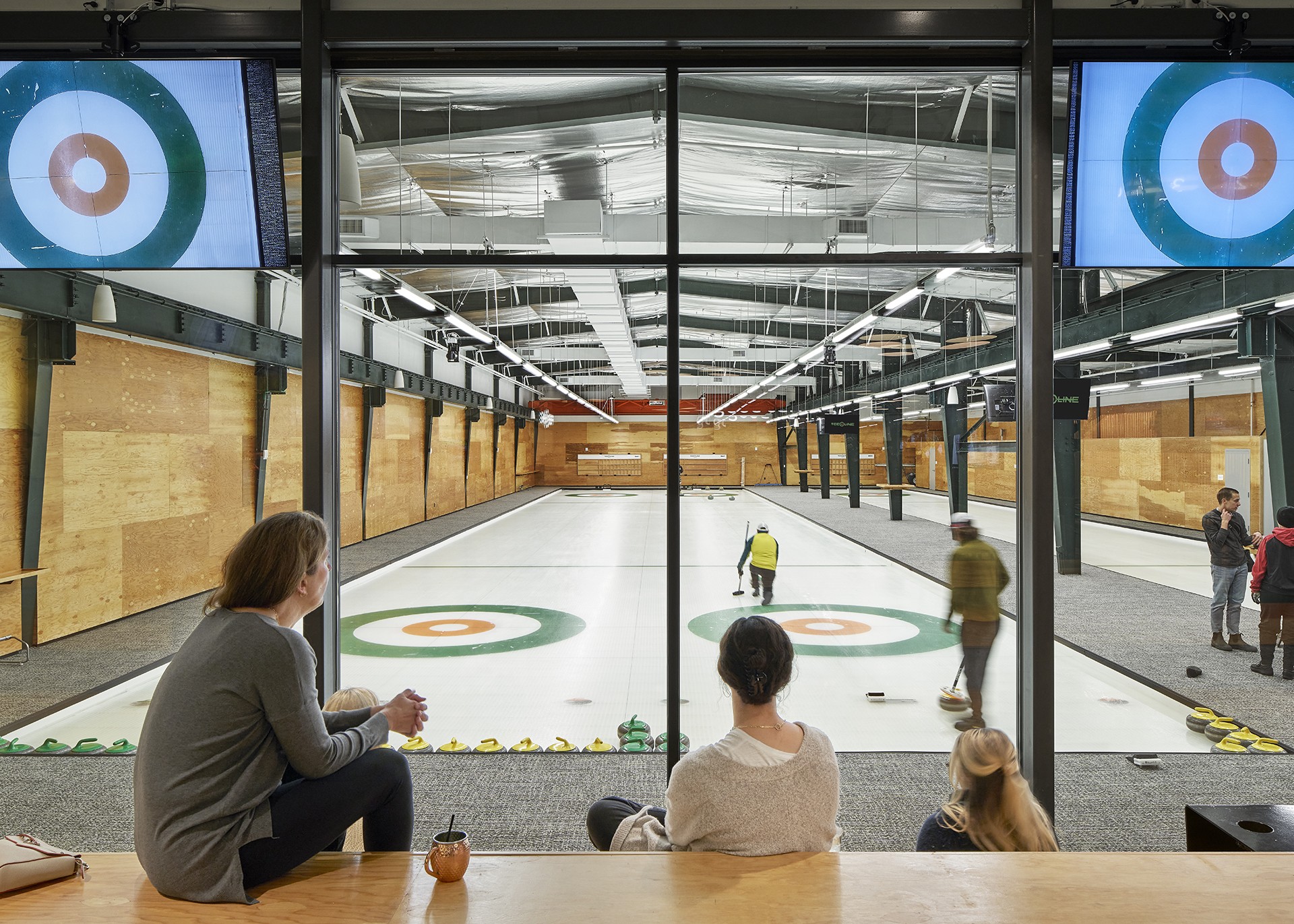 The new facility has a full bar and restaurant, three curling sheets, and four bowling lanes. It’s intended to be a place to curl, but also to hang out as a regular neighborhood gathering spot. Centric managed the complete project including everything from the ice system design (Trane Technologies and Quest Design Group) through kitchen equipment (Mobile Fixture), furniture (Alfred Williams) and interior and exterior signage (Sift Design).