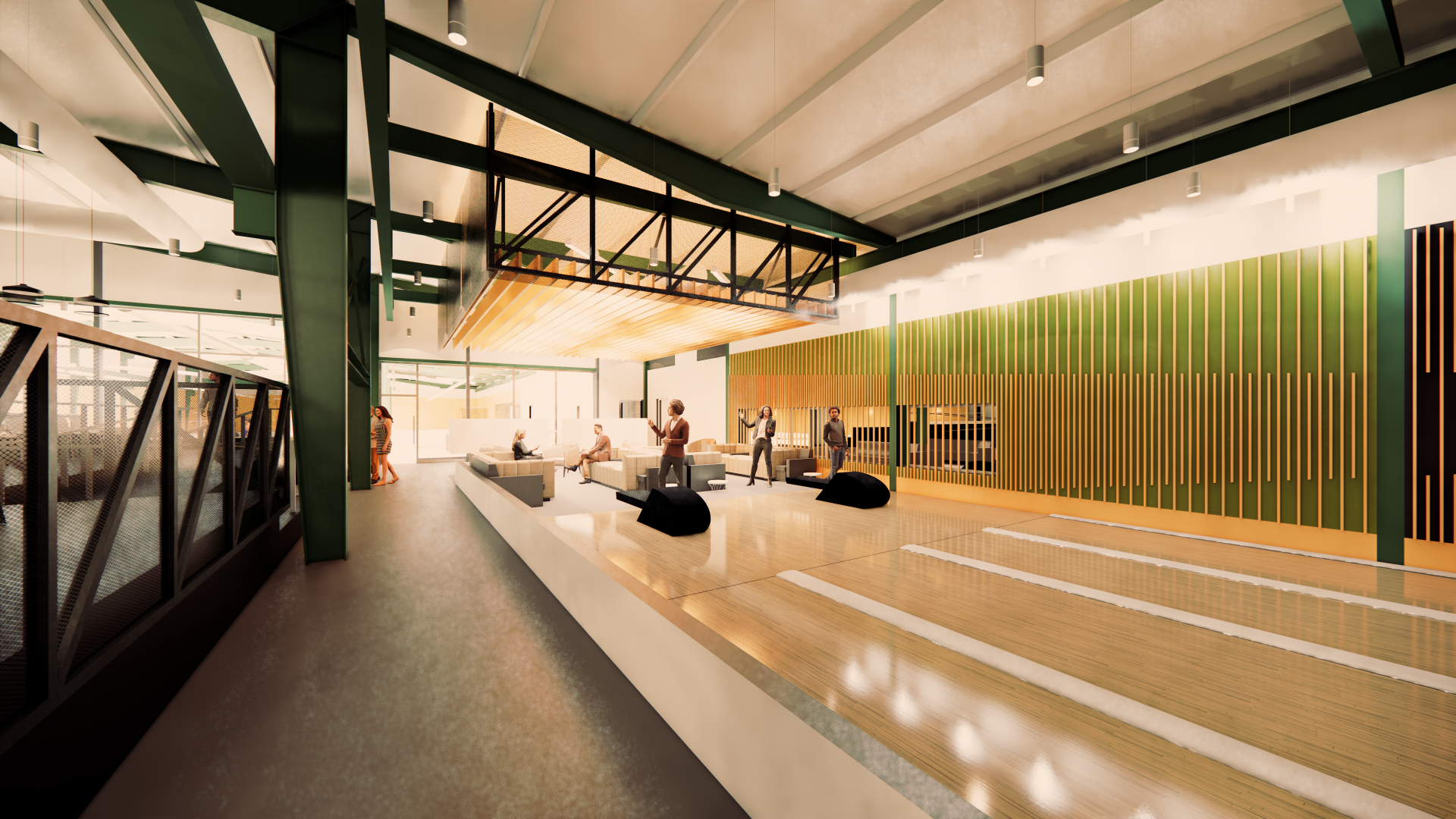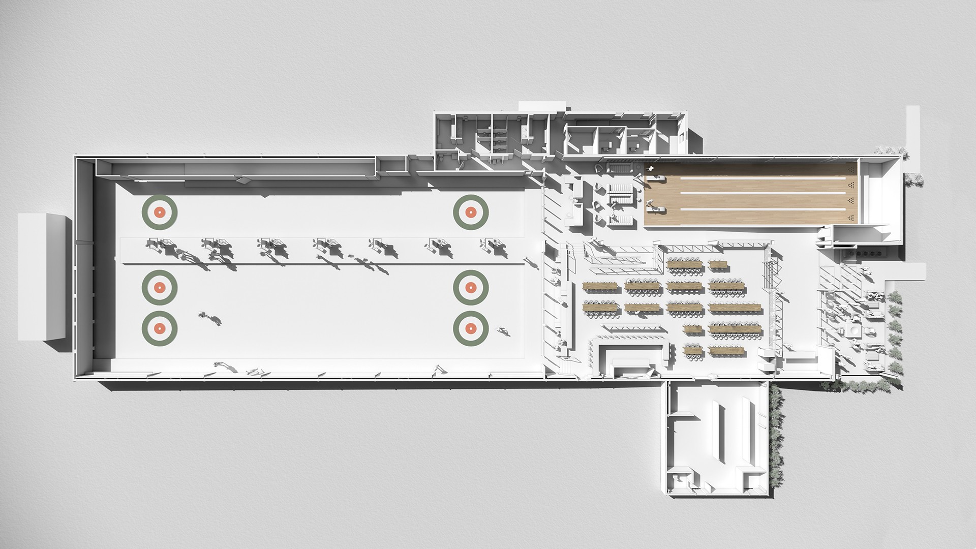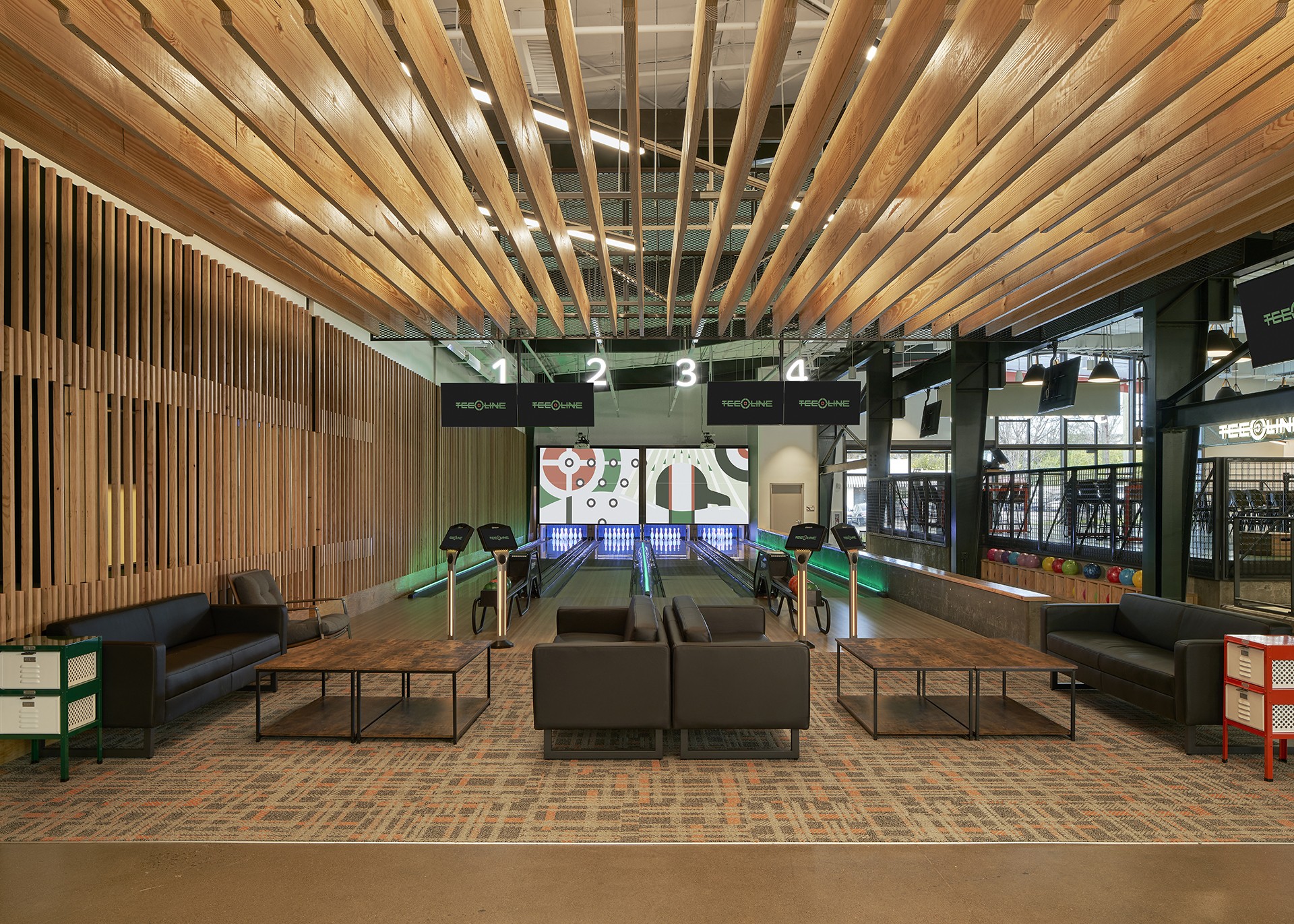 The new facility has a full bar and restaurant, three curling sheets, and four bowling lanes. It’s intended to be a place to curl, but also to hang out as a regular neighborhood gathering spot. Centric managed the complete project including everything from the ice system design (Trane Technologies and Quest Design Group) through kitchen equipment (Mobile Fixture), furniture (Alfred Williams) and interior and exterior signage (Sift Design).