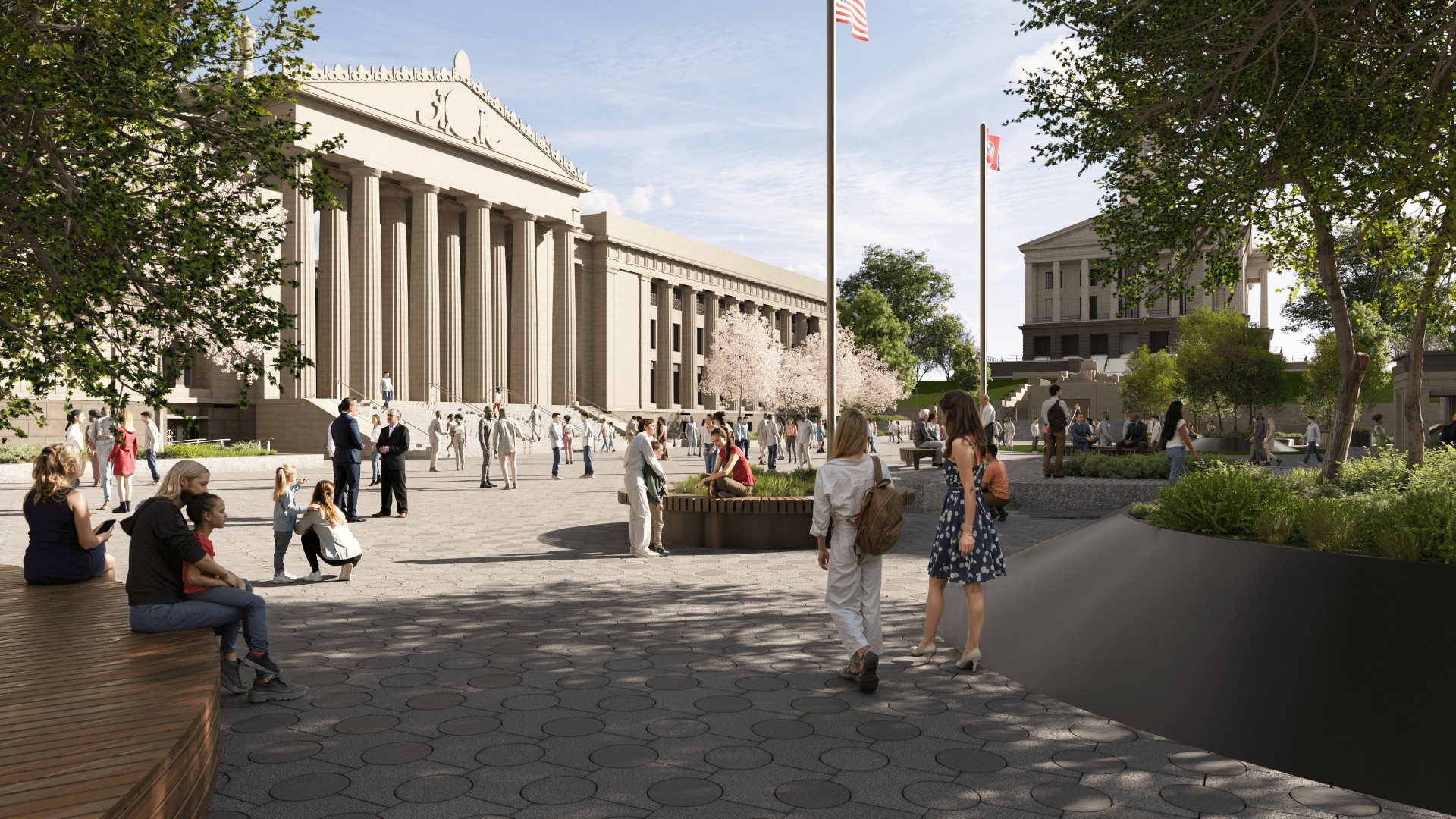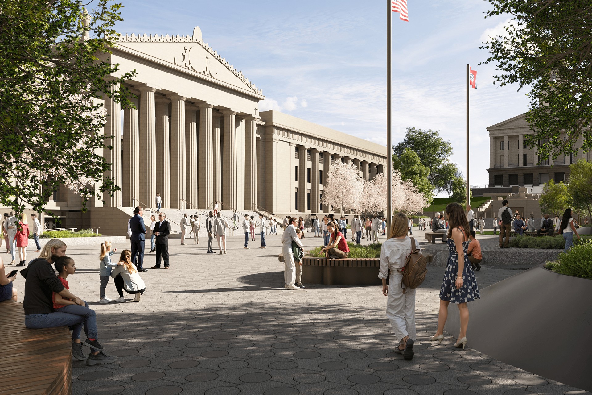 The south wing will continue to house the Tennessee Performing Arts Center in the War Memorial Auditorium, several Veterans’ organizations, and storage space for the Department of General Services & Facilities. The south wing improvements will include new mechanical and sprinkler systems; improvements to the auditorium for better handicap access, and a new ramp and loading dock. All new building systems will be provided on the ground floor for new offices and conference spaces. The existing elevator will be fully modernized. There will not be aesthetic work to the auditorium, other than areas that must be repaired as part of the building systems replacement. Existing finishes in the auditorium will need to be protected.