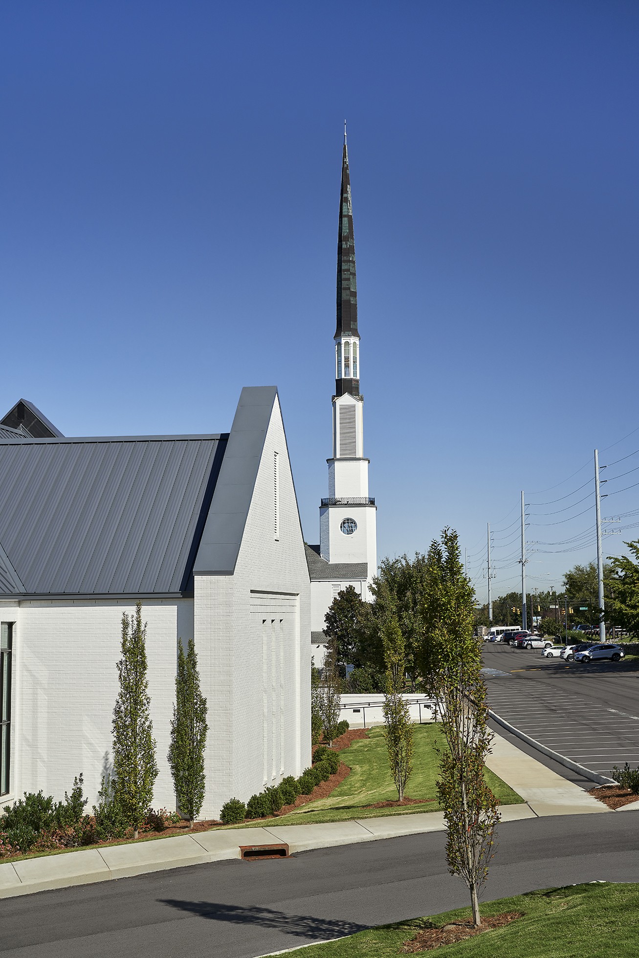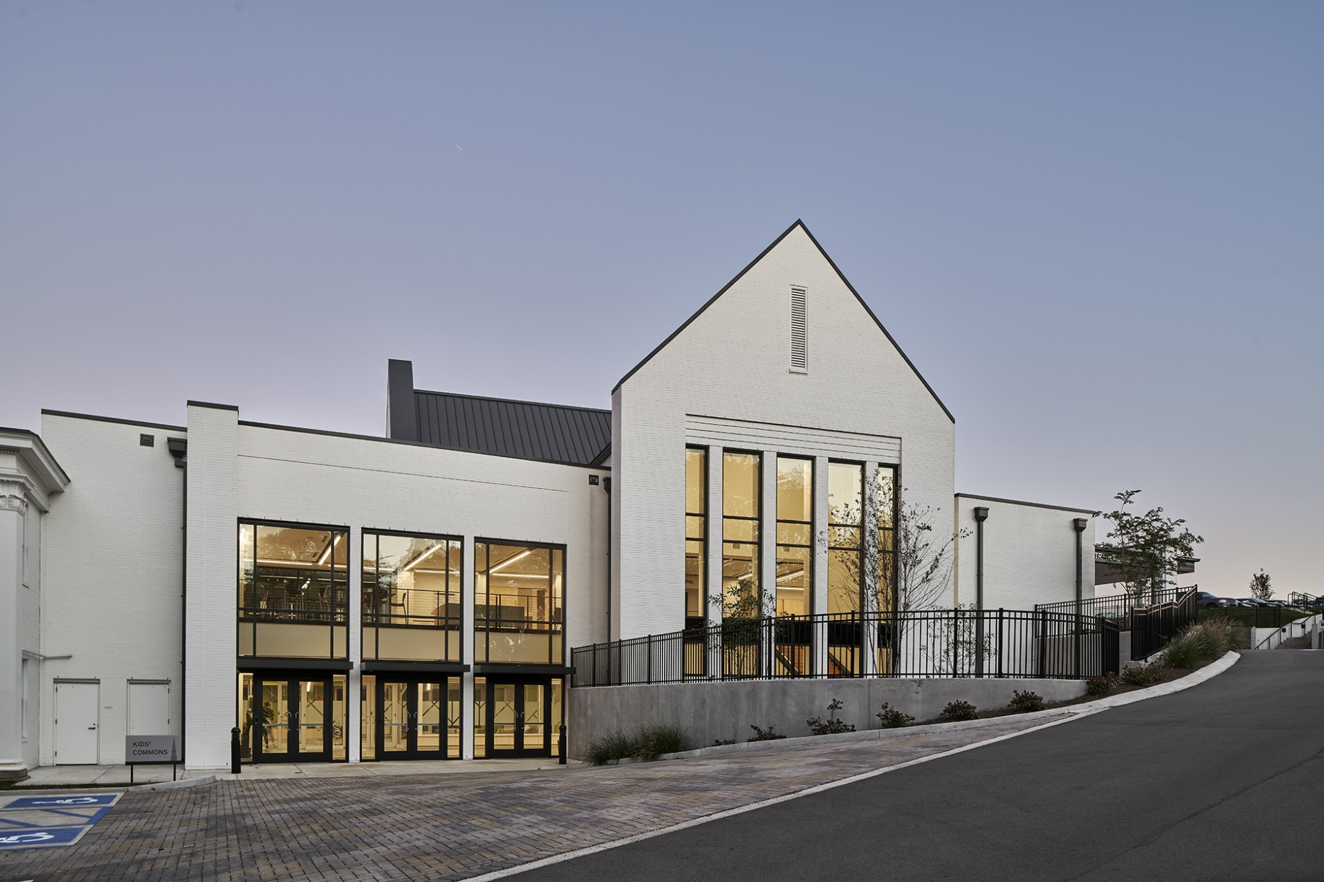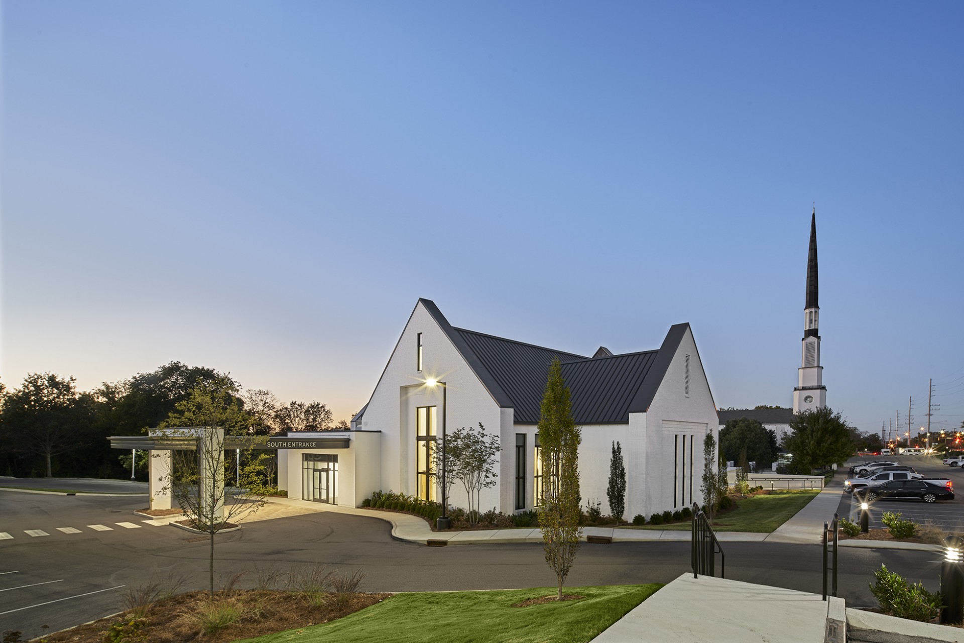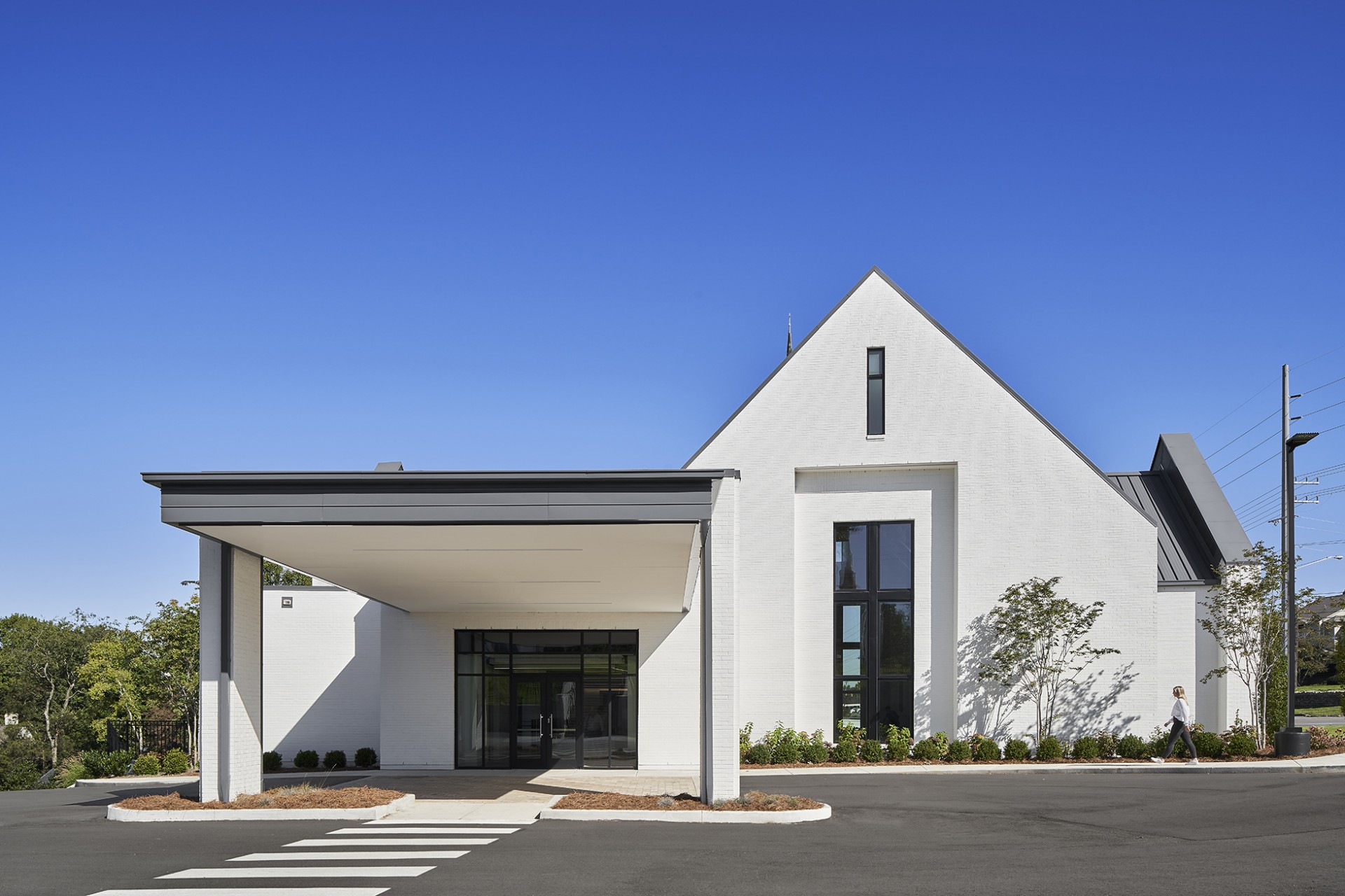 To honor 75 years of rich history as “a beacon and a bridge” to the Green Hills community of Nashville, Centric is honored to complete our third project at Woodmont Christian Church. This new multi-purpose chapel and expanded children’s education wing honors the tradition of the Edwin Keeble (1905-1979) designed original sanctuary from 1948. The chapel volume is oriented on a slight 15 degree angle to center its axis and focus on the existing 220-foottall spire. The white-painted brick form is simple and elegant to both reflect the existing architecture, while its clean modern details are indicative of the contemporary worship service to which this will become home. The interior of the chapel will be a crisp, light filled environment with accents of soaring natural wood trusses. The remaining gathering spaces and children’s education wing will be designed to integrate worship with families and playfulness with colorful flexible classrooms, a kids’ gathering/chapel space, and a large communicating stair anchoring a two-story gathering space that serves as informal seating and is complemented by a sculptural play slide.