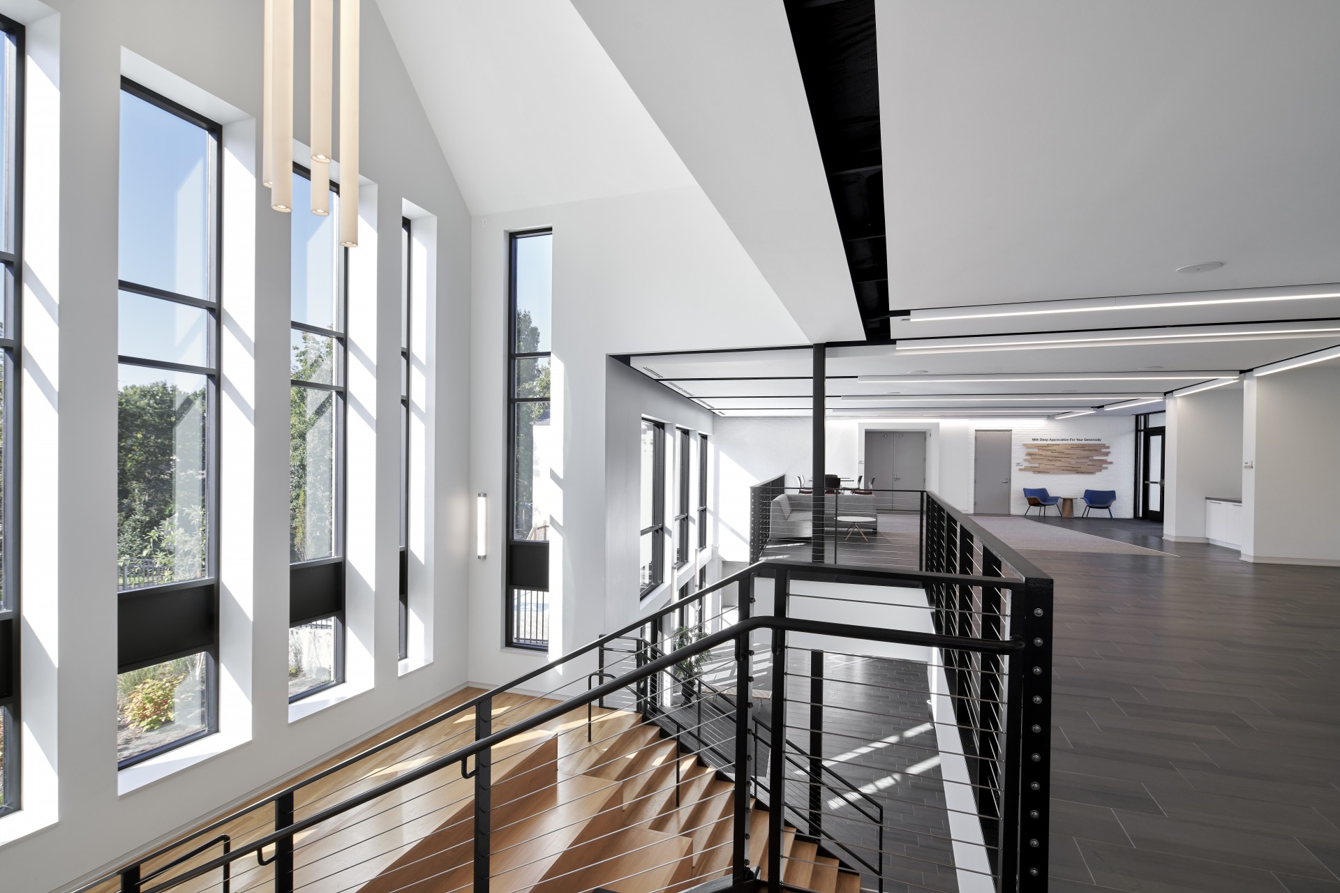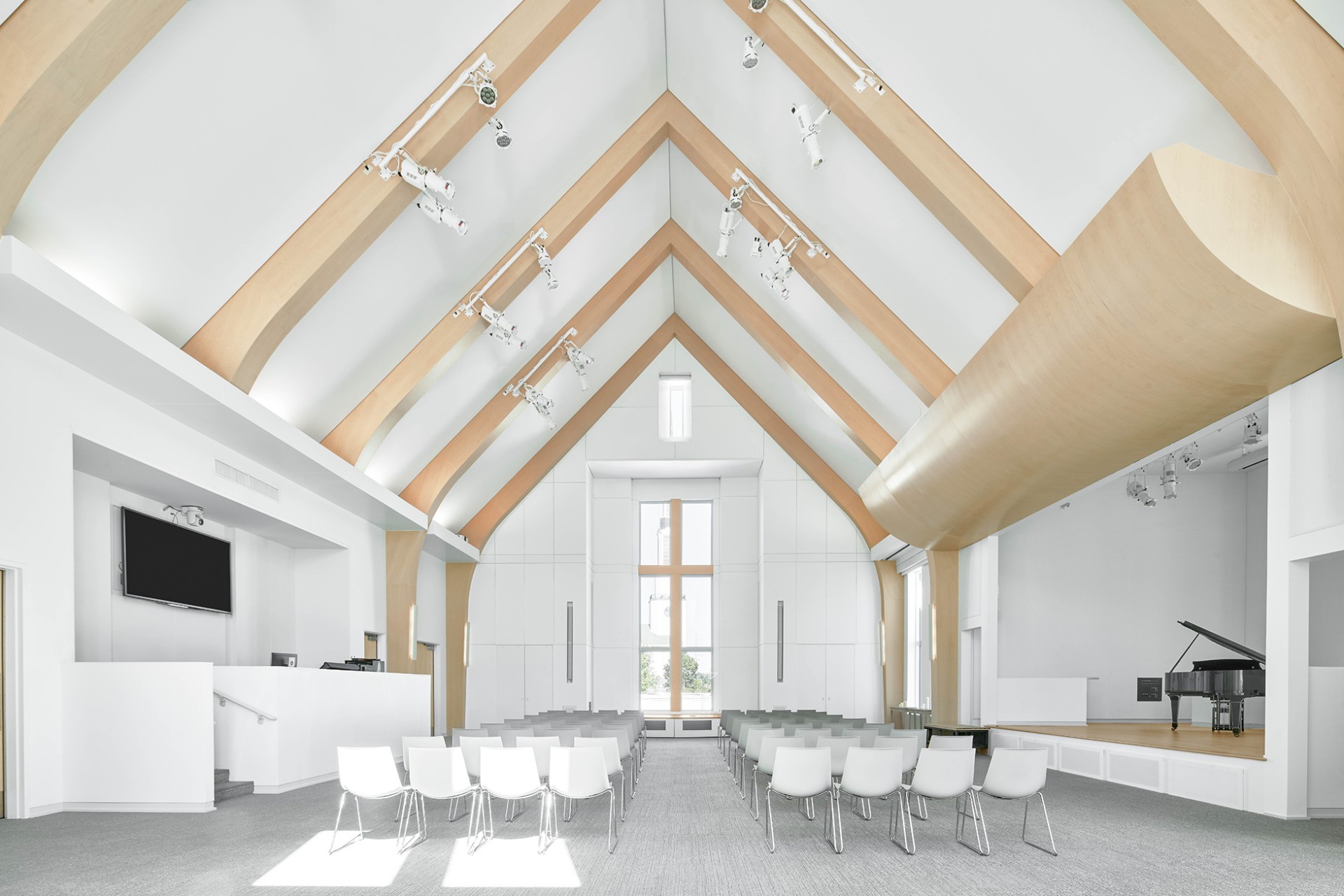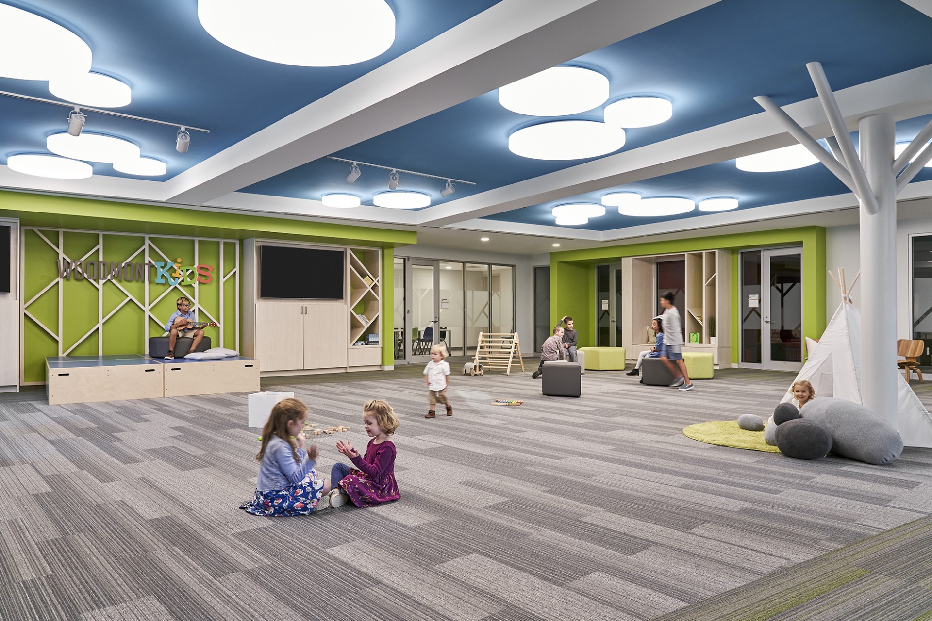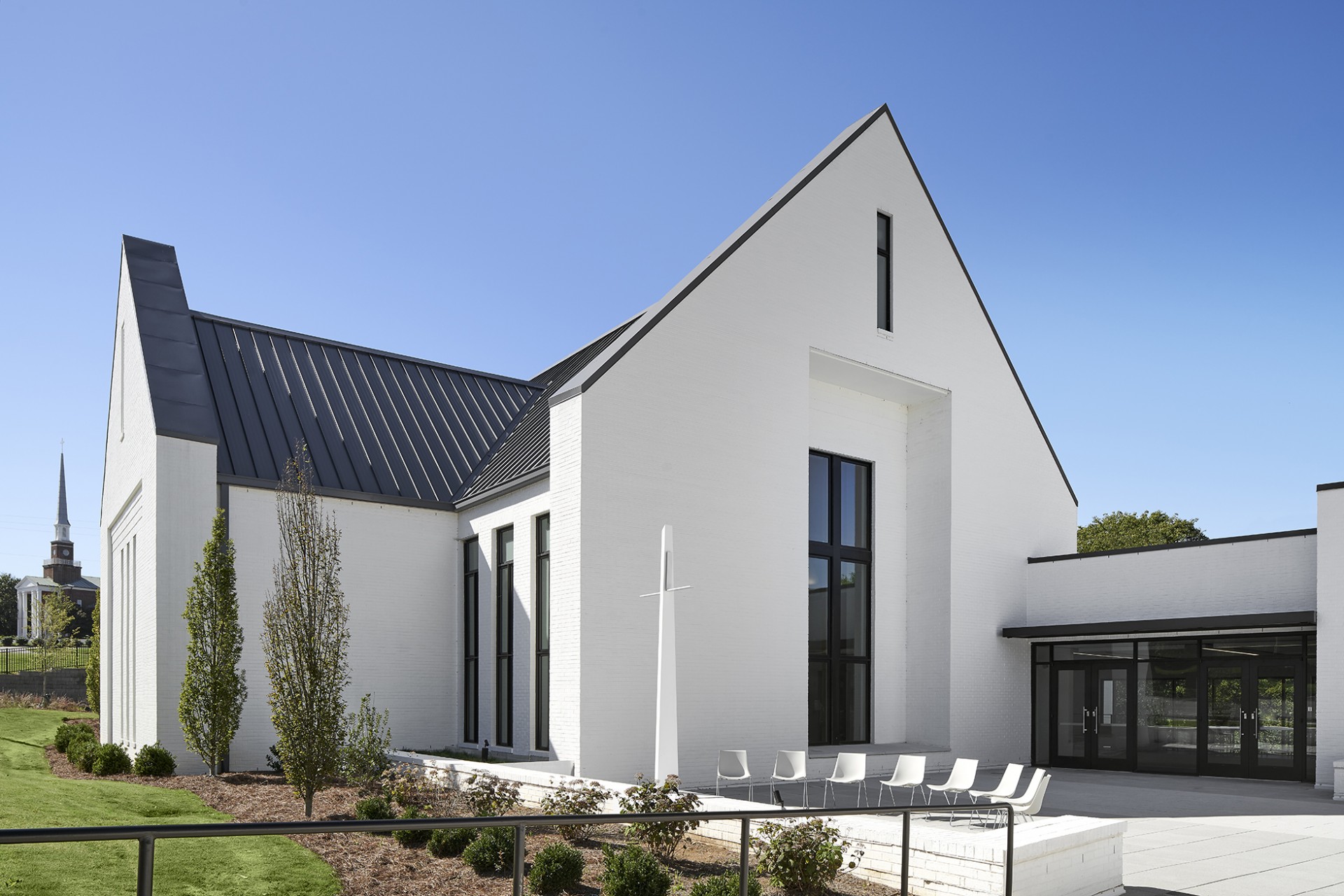 To honor 75 years of rich history as “a beacon and a bridge” to the Green Hills community of Nashville, Centric is honored to complete our third project at Woodmont Christian Church. This new multi-purpose chapel and expanded children’s education wing honors the tradition of the Edwin Keeble (1905-1979) designed original sanctuary from 1948. The chapel volume is oriented on a slight 15 degree angle to center its axis and focus on the existing 220-foottall spire. The white-painted brick form is simple and elegant to both reflect the existing architecture, while its clean modern details are indicative of the contemporary worship service to which this will become home. The interior of the chapel will be a crisp, light filled environment with accents of soaring natural wood trusses. The remaining gathering spaces and children’s education wing will be designed to integrate worship with families and playfulness with colorful flexible classrooms, a kids’ gathering/chapel space, and a large communicating stair anchoring a two-story gathering space that serves as informal seating and is complemented by a sculptural play slide.