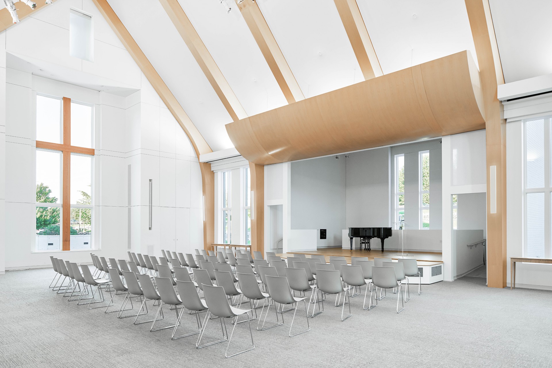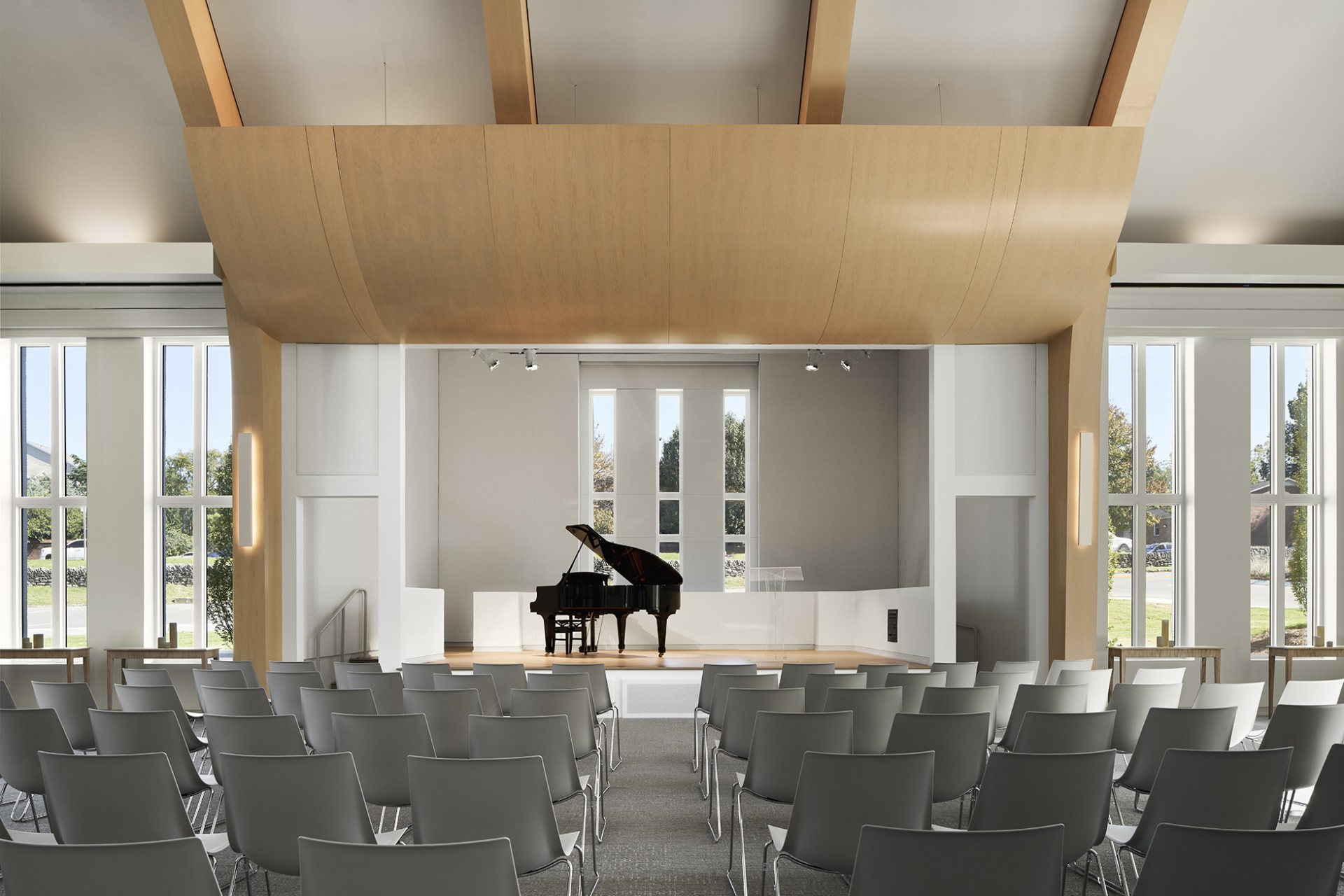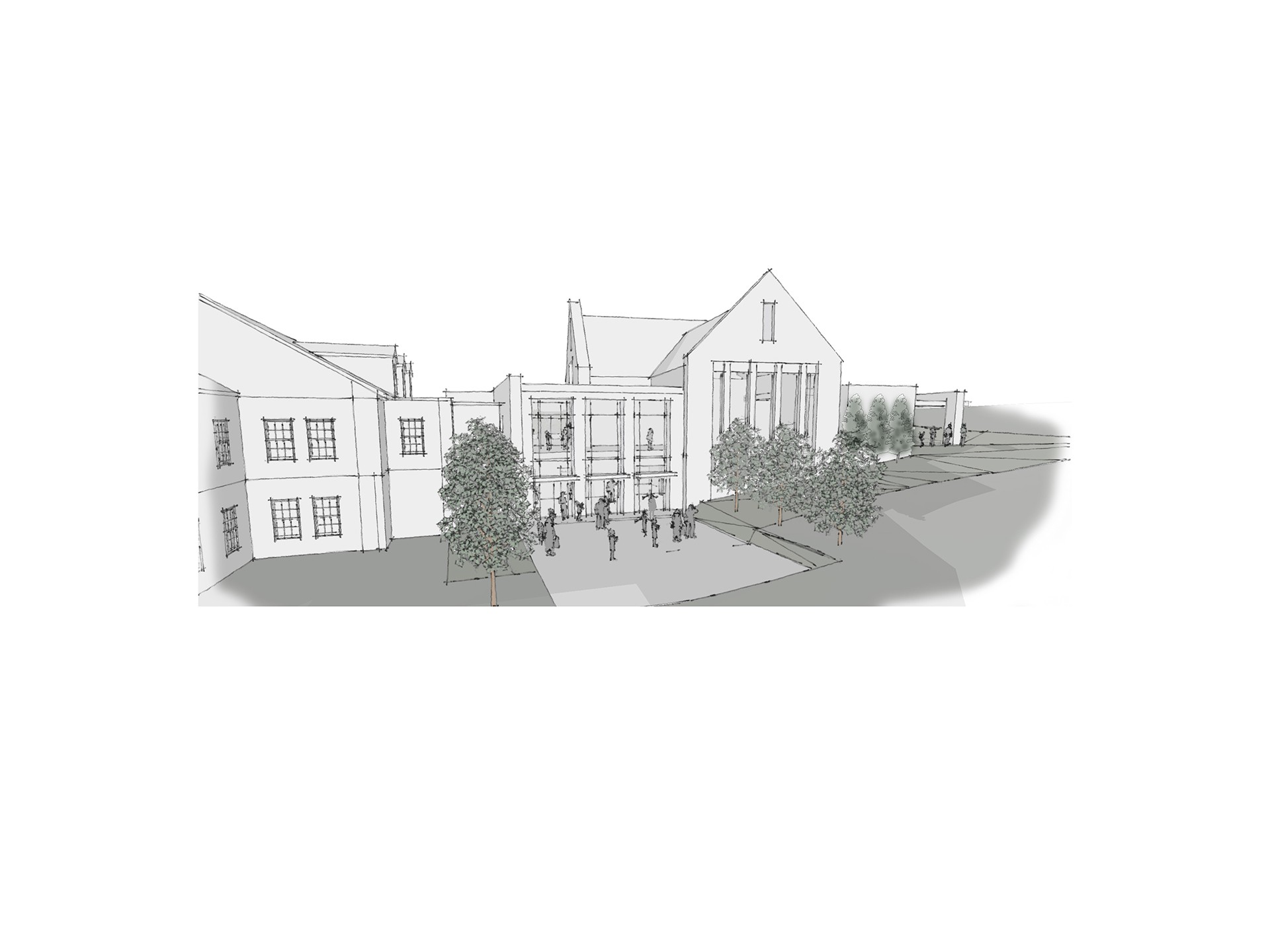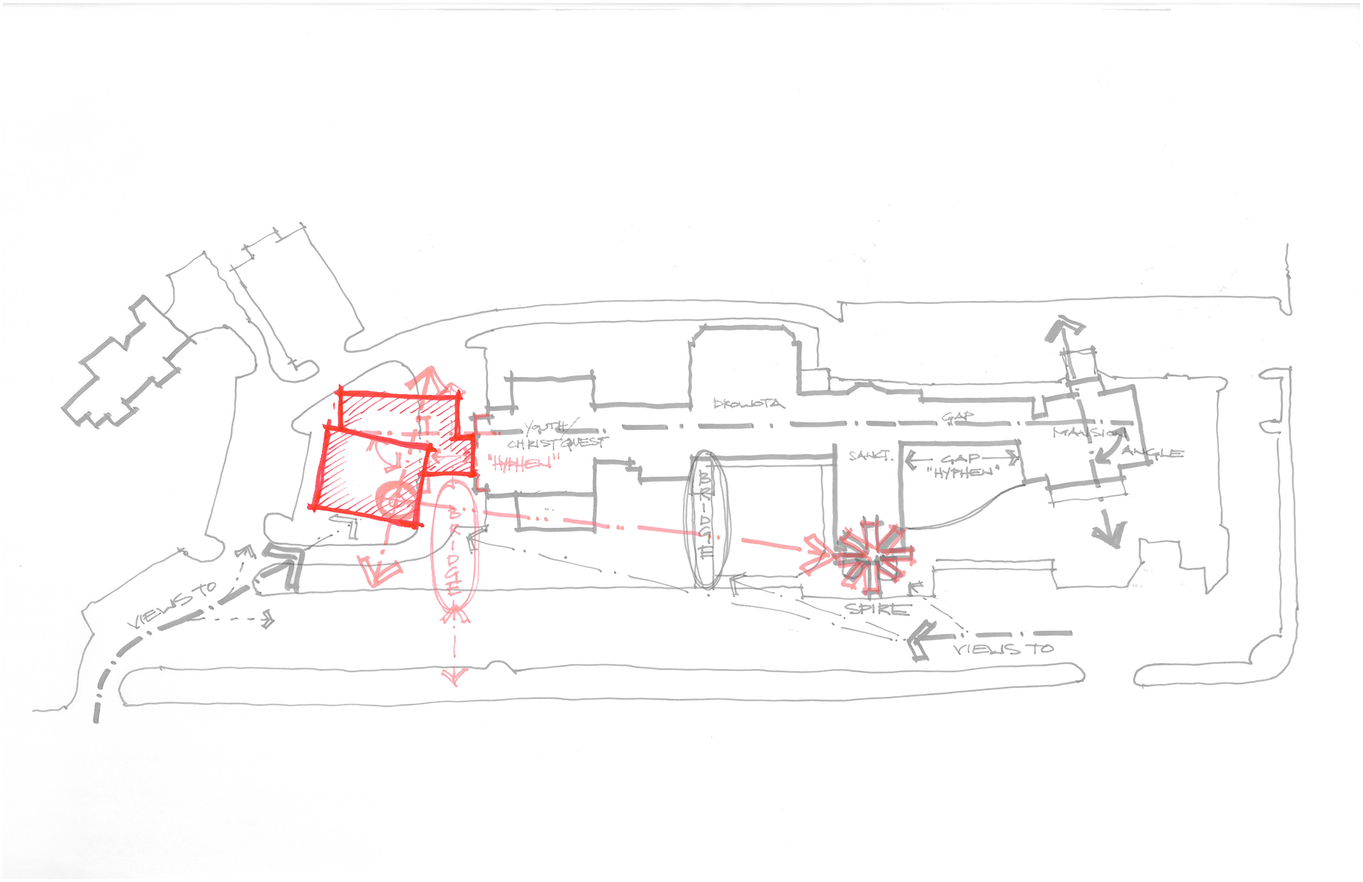 To honor 75 years of rich history as “a beacon and a bridge” to the Green Hills community of Nashville, Centric is honored to complete our third project at Woodmont Christian Church. This new multi-purpose chapel and expanded children’s education wing honors the tradition of the Edwin Keeble (1905-1979) designed original sanctuary from 1948. The chapel volume is oriented on a slight 15 degree angle to center its axis and focus on the existing 220-foottall spire. The white-painted brick form is simple and elegant to both reflect the existing architecture, while its clean modern details are indicative of the contemporary worship service to which this will become home. The interior of the chapel will be a crisp, light filled environment with accents of soaring natural wood trusses. The remaining gathering spaces and children’s education wing will be designed to integrate worship with families and playfulness with colorful flexible classrooms, a kids’ gathering/chapel space, and a large communicating stair anchoring a two-story gathering space that serves as informal seating and is complemented by a sculptural play slide.
