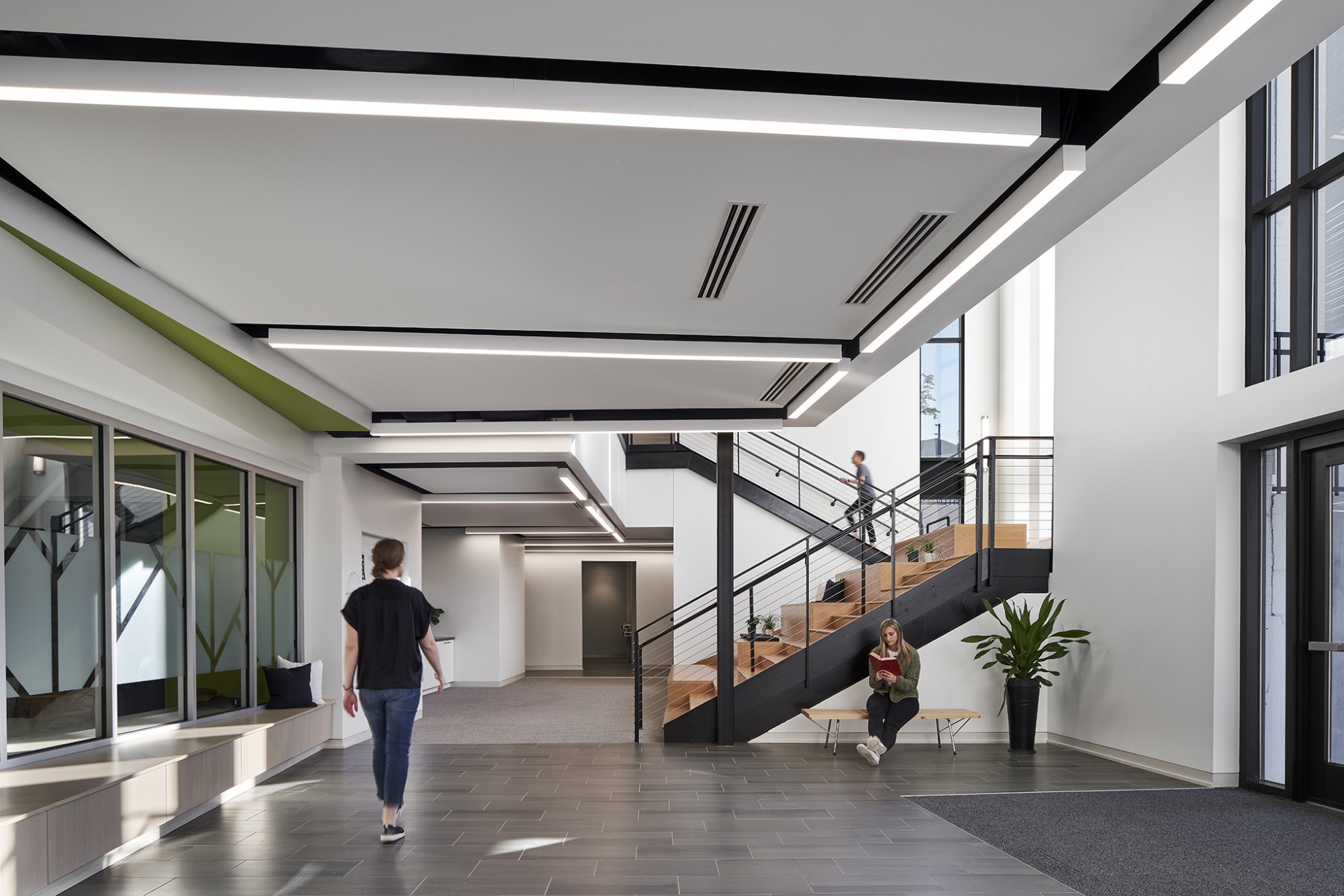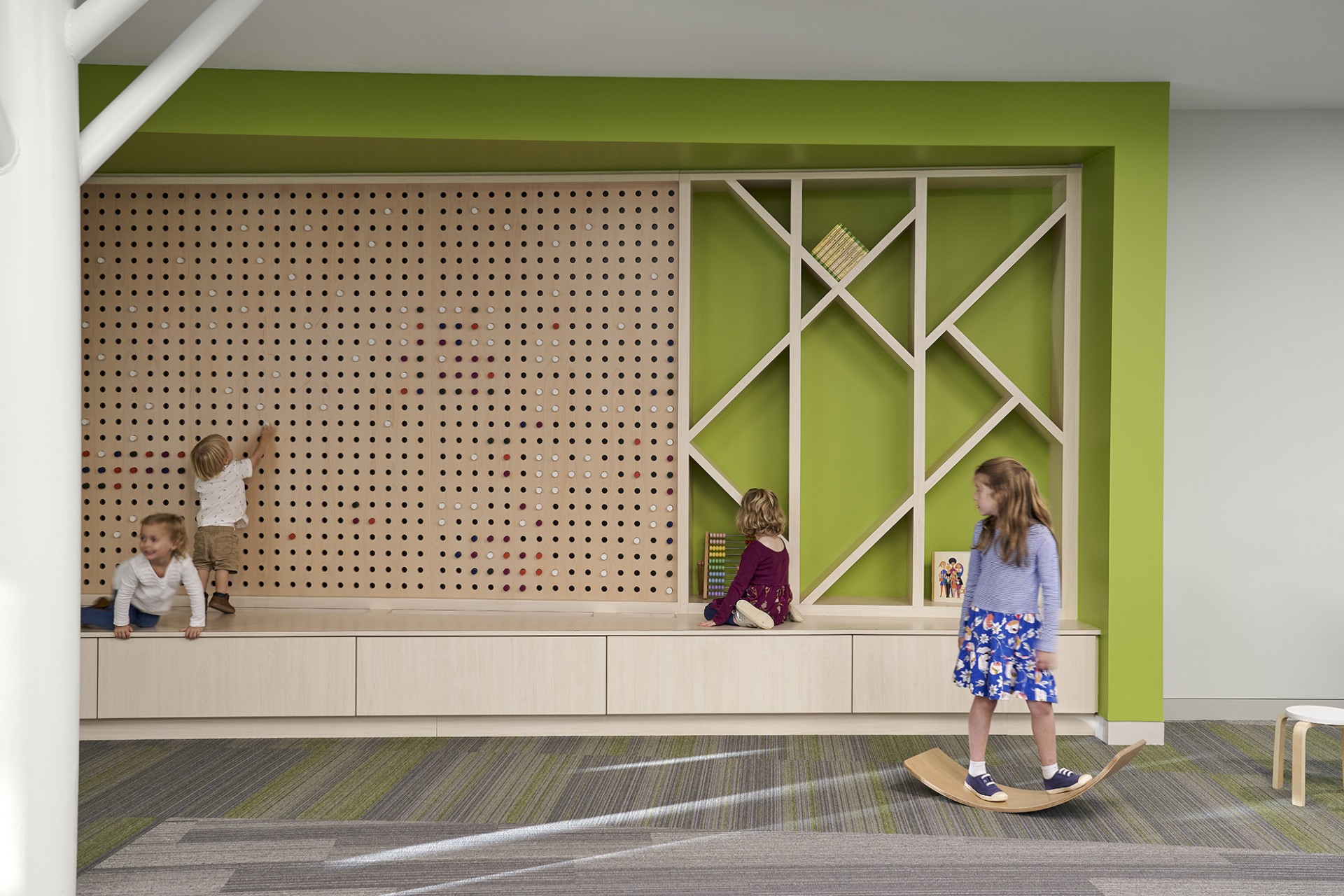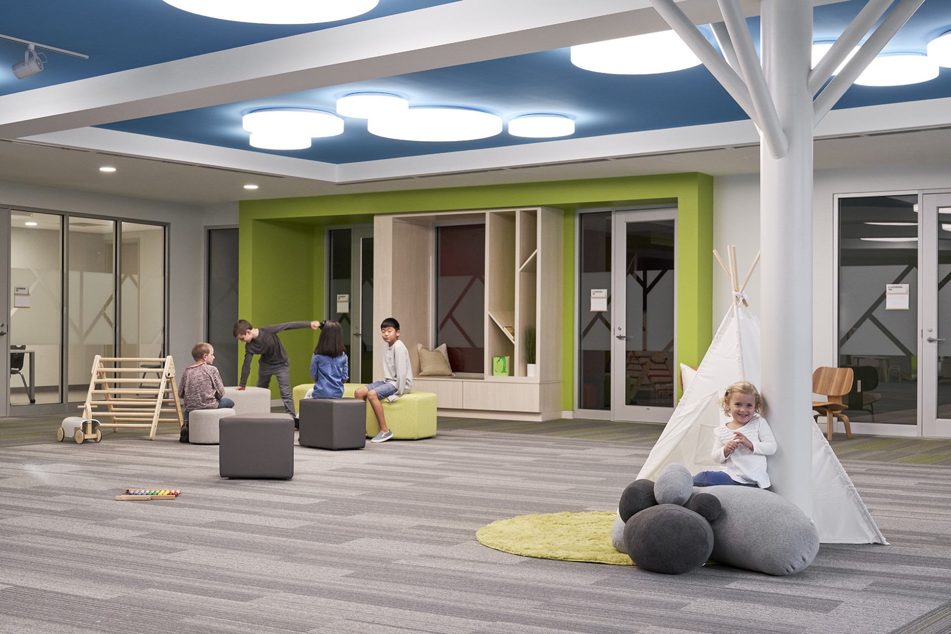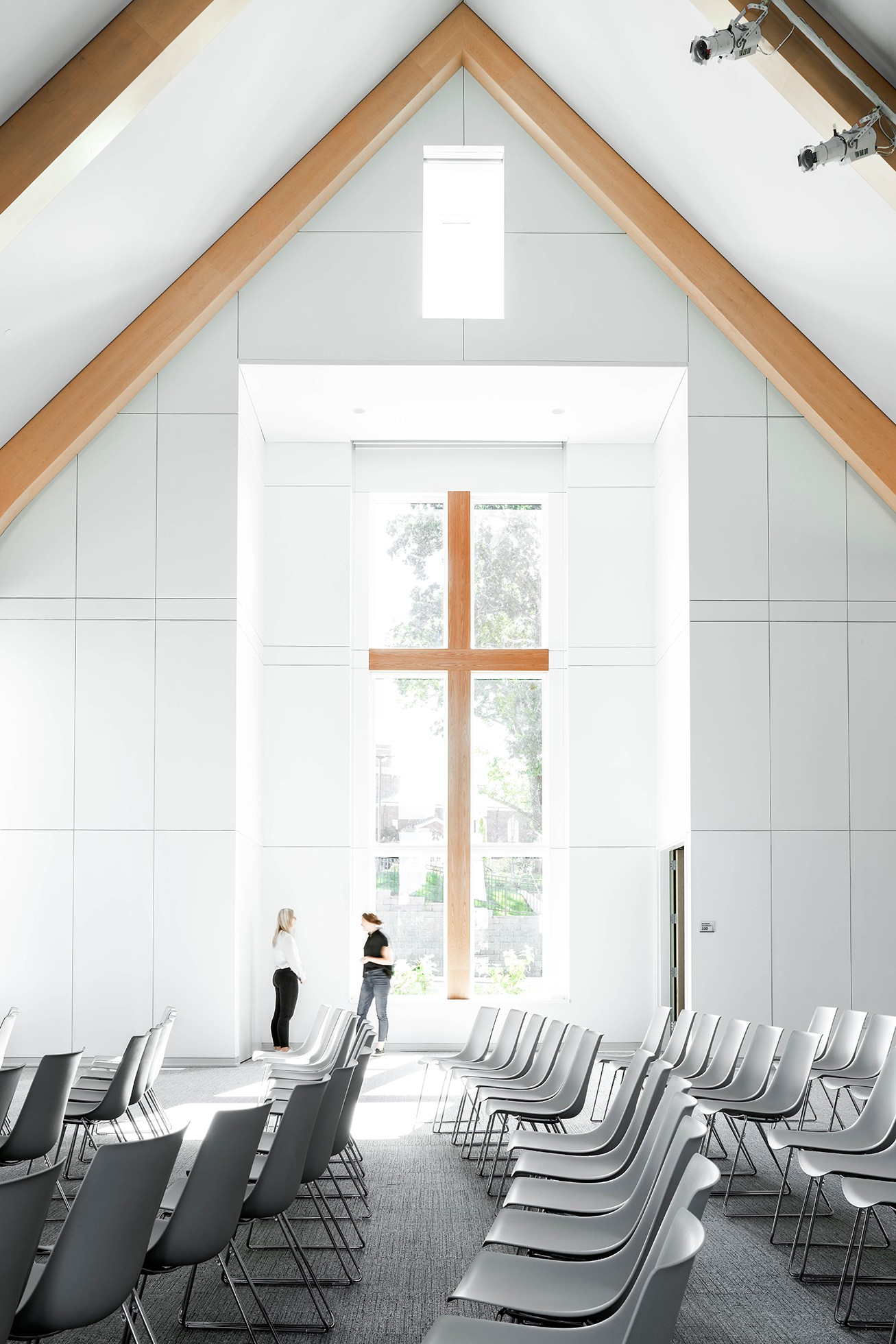 To honor 75 years of rich history as “a beacon and a bridge” to the Green Hills community of Nashville, Centric is honored to complete our third project at Woodmont Christian Church. This new multi-purpose chapel and expanded children’s education wing honors the tradition of the Edwin Keeble (1905-1979) designed original sanctuary from 1948. The chapel volume is oriented on a slight 15 degree angle to center its axis and focus on the existing 220-foottall spire. The white-painted brick form is simple and elegant to both reflect the existing architecture, while its clean modern details are indicative of the contemporary worship service to which this will become home. The interior of the chapel will be a crisp, light filled environment with accents of soaring natural wood trusses. The remaining gathering spaces and children’s education wing will be designed to integrate worship with families and playfulness with colorful flexible classrooms, a kids’ gathering/chapel space, and a large communicating stair anchoring a two-story gathering space that serves as informal seating and is complemented by a sculptural play slide.